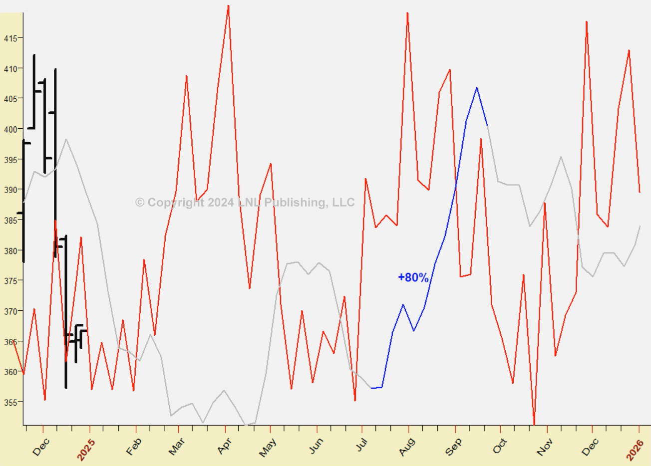 『ラリー・ウィリアムズのフォーキャスト2025』を個別の株式と先物にどう活用するのが一番良いか、詳しく話したいと思います。まずは、キャタピラー(CAT)のサイクルをご覧ください。