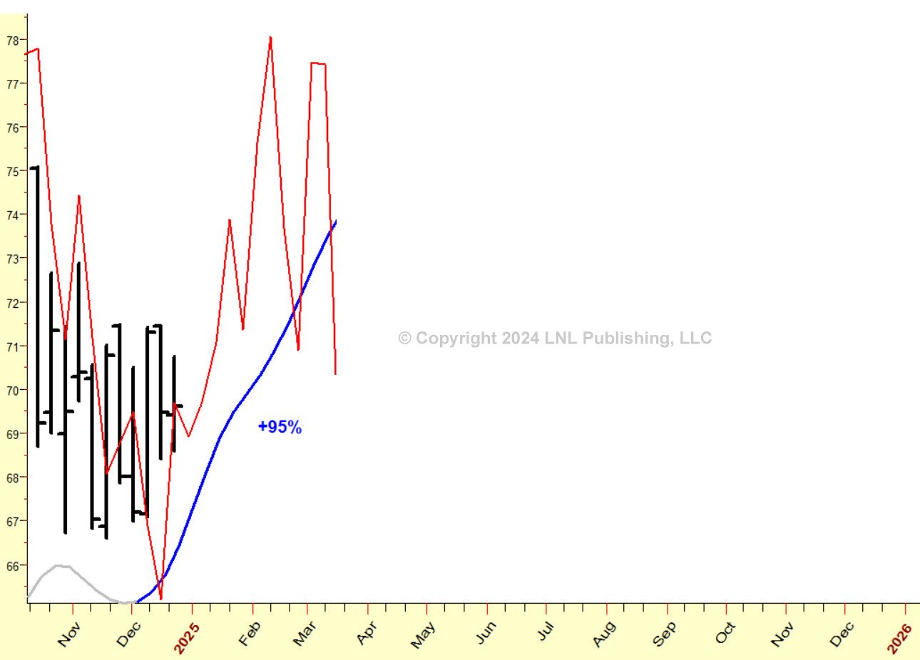 サイクルは株価や市場指数だけでなく、天気や人間関係、投資など、あらゆるものに影響を与えます。このチャートから原油価格は上昇傾向にあり、3月までは強気相場が続く可能性が高いことがわかります。