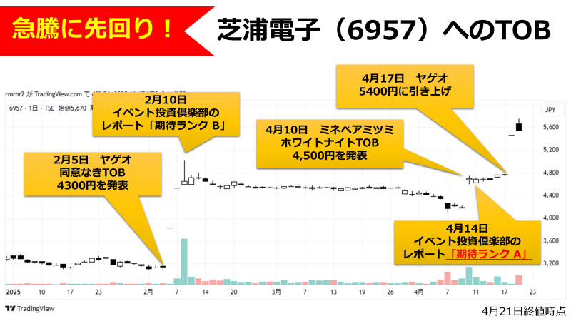 イベント投資の名人、羽根英樹さんのオンライン講座『イベント投資倶楽部』では、週1回のレポートと月1回のオンラインセミナーで、直近のTOBの解説やトレード戦略、検証データを解説しています。