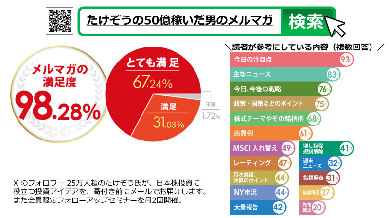 各新聞紙の報道やNY市場の動向、日本市場に影響のある主なニュースと関連銘柄例など、多くの投資のヒントを寄付き前にお届けする『たけぞうの50億稼いだ男のメルマガ』が好評いただいています。