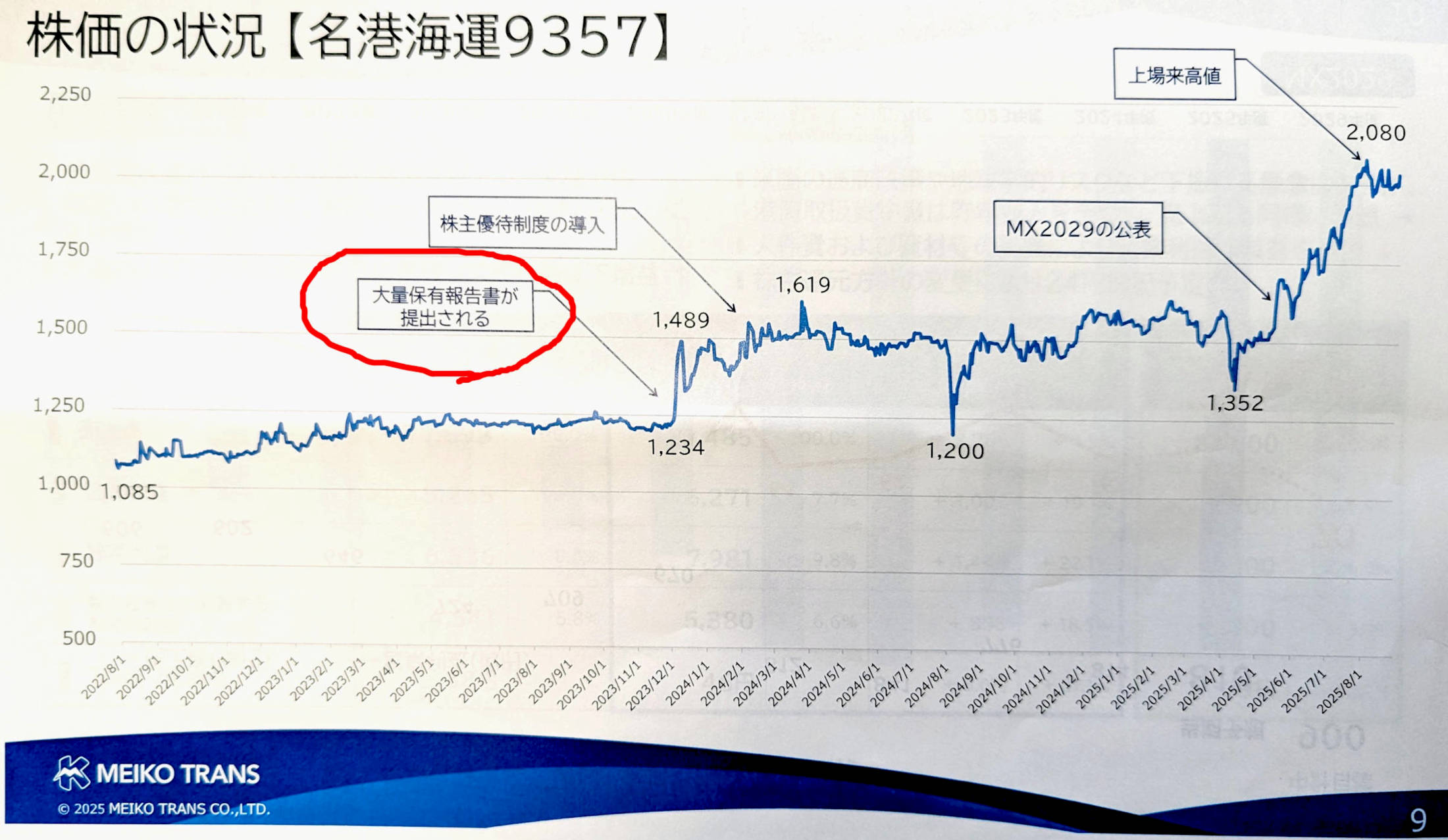 例えば、名港海運(9357)は、名古屋港の港湾運送の会社で、決して派手な会社ではないが、2023年に、ニッポンアクティブバリュ―ファンドが大株主に登場している。担当者によれば、その後、アクティビスト側からの接触はなかったが、株主還元を重視することになり、株主優待、配当性向のアップ、DOE採用、中期経営計画の策定などを次々実施することにより、株価が上がり、結果的には、アクティビスト参入によって良い影響があった事になる事例だ。こんな事が判るのもIRエキスポならではではないだろうか。