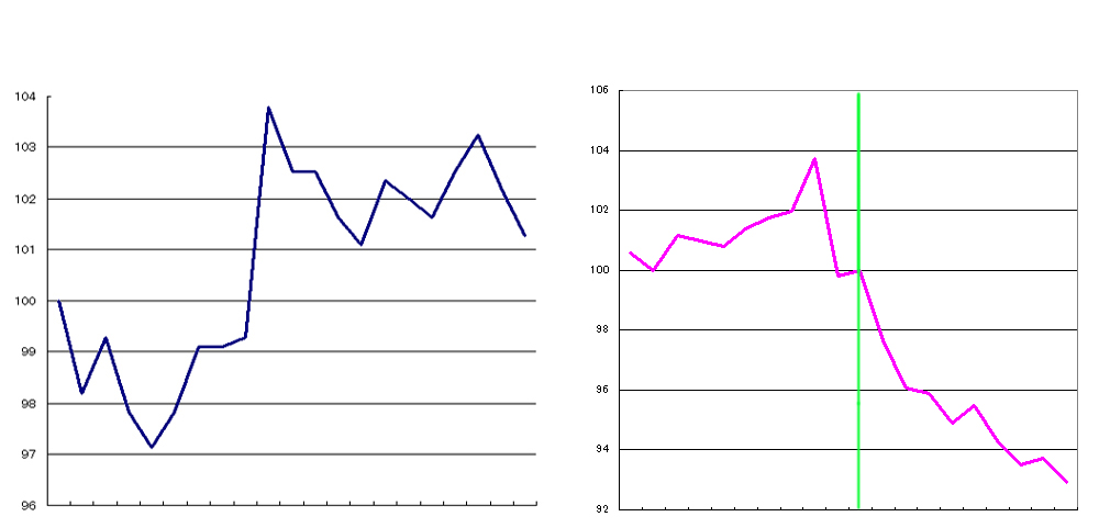 右のグラフは、サミット開催初日の終値を100とした前後10営業日の終値グラフです。サミット初日の7月7日のところに緑の縦線をいれています。グラフを見ると、サミット開催3日前を天井に下がり続けてます。サミット開催中も下がり続けていますね。一番ウインザーホテルが脚光を浴びている最中に下げているのは、セコムとウインザーホテルの関係が知られていなかったのでしょうか?しかし当時のニュースをみると、洞爺湖にサミット開催を決めた安倍首相とセコムとの間に某かの関連がある旨が載っていますので、当時の市場参加者が知らなかった筈はありません。これは、予め開催が決まっているイベントによくあるパターンの「イベント時には天井を打っている」という事でしょう。
