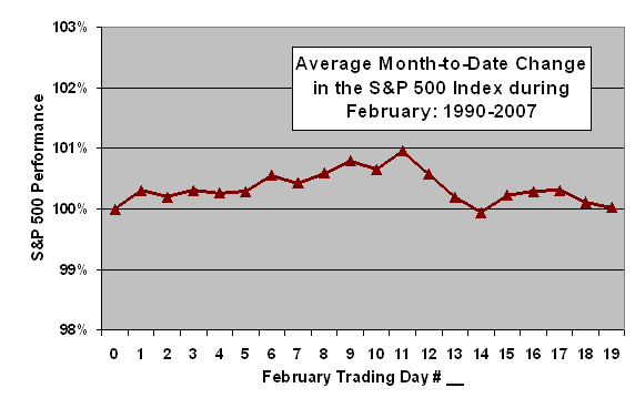 株式市場の統計、と言えばストック・トレーダーズ・アルマナックが有名だが、最近、cxoadvisory.comを利用する人たちが増えているような気がする。おそらく、前者は有料、後者は無料、ということが多分に影響していると思うが、内容の点でもcxoadvisory.comは中々しっかりしている。 実際に、どんな統計があるのか、いくつか見てみよう。 これは、S&P500指数が、年間を通してどう動くかを示したものだ。(赤い線は、1990年から2008年の1月31日まで、そして黒い線は1950年から2008年の1月31日までを表す。) 下の数字0は前年度の取引終了日、21は取引の21日目、147は取引の147日目、一番右が年最後の取引日になる。左に見える%の付いた数字は、0の日を100%として、S&P500指数が、どう伸びるかを表示している。 これを見て分かることは、マーケットの上昇が目立つのは、最初の三分の一と、終わりの三分の一だ。105日目を過ぎる頃から210日目頃まで、マーケットはパッとしない展開になる。 月別で見ると、株が最も好調なのは12月だ。 上は、1990年から2007年までの12月の様子だ。0は前月の最終日を表し、21は取引の21日目を示す。好調、と言っても、上昇の顕著なのは月末に限られ、正にクリスマス・ラリーだ。 それでは、今月、2月を見てみよう。 横ばいだ。 cxoadvisory.comには興味深いデータが豊富にある。とにかく、アクセスしてみよう。 ( http://www.cxoadvisory.com/calendar/) (上はマーケットウォッチに載せたものです。 http://www.breakscan.com/usmw/archives/2008/0207.php#Recap)