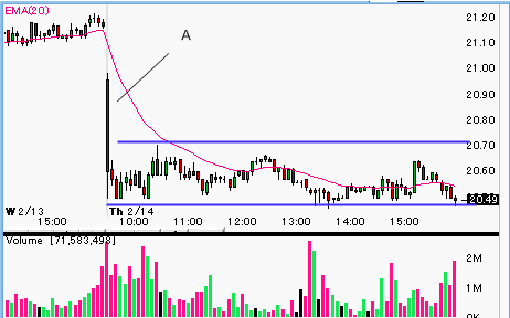 ゴールドマンサックスが、ダウ銘柄インテル(INTC)を、優先買いリストから削除した。 上はインテルの5分足チャートだが、見てのとおり、下げは最初の5分間(A)で終わり、その後は横ばいとなった。もし下辺を割ったら、どのあたりまで下げるだろうか?日足チャートを見てみよう。 こちらも横ばいだ。 (上はマーケット・レターから引用したものです。)