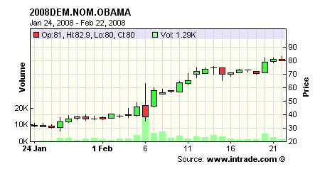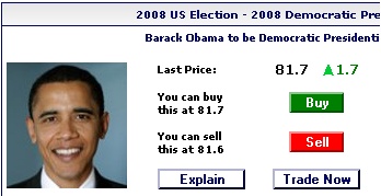 大統領選挙は11月だが、現在アメリカで行われている予備選挙は、党公認の大統領候補者を決めるためのものだ。 話題になっているのが、民主党の予備選挙、クリントン対オバマだ。さて、どちらが勝つだろうか? http://www.intrade.com/によると、オバマ氏の勝率は81.7%。 クリントン氏の勝率は18.4%だ。 Buy、Sellのボタンが見えるが、実はこのサイトで、どちらが勝つかに賭けることができる。 面白いことに、ローソク足チャートまで用意されている。 上はオバマ氏の日足。アップトレンドだ。 そして、下げ基調が明確になったクリントン氏のチャート。 他にも色々なイベントに賭けられるようだが、暇つぶしには面白いサイトだ。 http://southbaytrader.blogspot.com/ http://www.breakscan.com/usmw/