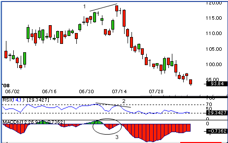 トレンドを判断するのに役立つのは、パラメーターを12にセットした、平滑移動平均線(エクポネンシャル・ムービング・アベレージ、EMA)だ。見てのとおり、右下がりが顕著な今日、マーケットはダウントレンドと言ってさしつかえない。更に、12/26/9に設定したMACDのヒストグラムを入れることで、底や天井の警報シグナルを得ることができる。