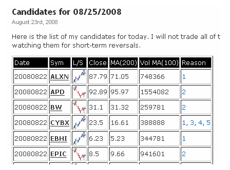 Candidates for 08/25/2008、というのは、8月25日(月)の候補銘柄という意味になる。面白いのは、何故これらの銘柄が選ばれたかが、数字を使って一番右の欄(Reason)で示されている。下記が数字の説明だ。