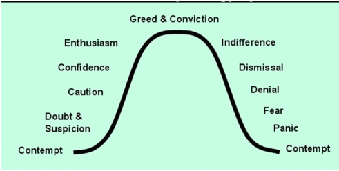 Fear, panic and contempt(恐怖、パニック、軽視): 拒否の態度を継続できなくなりパニック売り。そして、軽視段階へと進んで行く。