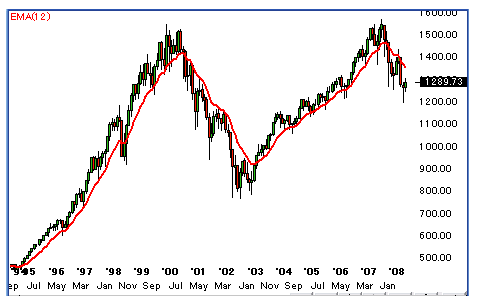 マーケットには、底、上昇、天井、そして下げの四段階があることが知られている。それでは質問しよう。現在の米国株式市場は、どの段階にあるのだろうか?S&P500指数の月足チャートを見てみよう。