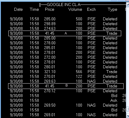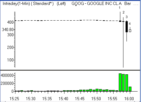 水曜の寄付き前、メッセンジャーを使って、馬渕氏(デイトレードネットCEO)から、こういう質問が来た。「GOOGに関してニュースが何かありますか?もの凄いギャップアップの数字が出ていますが。」 GOOGはグーグルのことだが、実は、前日の大引け直前に一波乱があった。先ず、ニュースレターで説明した、一波乱の部分を抜粋しよう。 下は、グーグル(GOOG)の1分足チャートだ。終了間際の4分間に注目してほしい。 1、15時57分:高値 483.63、安値 404.04、 出来高 453845 2、15時58分:高値 438.00、安値 41.45、 出来高 444277 3、15時59分:高値 414.15、安値 250.02、 出来高 427532 4、16時: 高値 360.00、安値 323.00、出来高 117242 グーグルが41ドル45セント?本当に、そんな値段で売買されたのだろうか。タイム・アンド・セールスで取引を振り返ってみよう。 A、15時58分: 41ドル45セントで100株 B、15時58分: 41ドル45セントで200株 マーケット終了後、ナスダックは、グーグルの一部の取引を無効にすると発表した。ロイターから引用しよう。 「ナスダックからの説明によると、他の証券取引所から転送されてきたオーダーが原因となって、突然グーグルの株価が急落した。そのためナスダックは、午後3時57分から4時2分までのグーグル取引で、425ドル29セント以上、そして400ドル52セント以下で執行された売買を全て無効にすることを決定した。更に、ナスダックは、この決定に対する抗議を一切受け付けないことも付け加えた。」 というわけで、グーグルの火曜の終値が341ドル13セントと記録されてしまい、水曜、大きな窓を開けての寄り付きになったわけだ。(注:ナスダックは、グーグルの終値を341ドル13セントから400ドル52セントに修正した。) もちろん、「決定に対する抗議を一切受け付けない」というナスダックの態度が非難されているのは言うまでもないが、火曜の大引け間際に、不規則な取引が生じたのはグーグルだけではなかった。 実は、ゼネラル・エレクトリック(GE)、それにロジャーズ・コーポレーション(ROG)のニューヨーク証券取引所に上場されている銘柄にも、おかしな売買が起きていた。 火曜は9月30日、月末であり、第3四半期の最終日でもあったから、ファンドマネージャーによる「お化粧」が起き易い日だった。もちろん、不正があった、という証拠は無いのだか、投資家たちは、このタイミングに疑問を抱かずにはいられない。 それに、もう一つ、9月30日はヘッジファンド解約申込みの最終日だった。ご存知のように、株の低迷で、多くのヘッジファンドは投資家が満足できるような成績を上げていない。繰り返すが、不正があったという証拠は無いが、こんなタイミングでは火曜の不規則な取引が単なる事故であった、と素直に片付けることができない人たちが多い。 (情報源: http://bigpicture.typepad.com/comments/2008/09/trusting-the-he.html http://seekingalpha.com/article/98003-not-just-oops-concerns-about-technical-glitches) NWTファイナンシャル・グループのニュースレター(無料)をご希望の方は、下記から申し込んでください。右側のSkypeのサインの下に、メールアドレスを入力してください。 http://www.nwt-jp.com/sec1/index.shtml