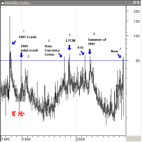 「58って冗談のような数字です」、とミミさんが書いておられたが、トレーダーの間では異常なレベルに達したボラティリティ指数が話題になっている。 先ず、極めて単純に、ボラティリティ指数の説明をしよう。 「ボラティリティ指数は逆指標であり、株式市場が下がる場面で上昇し、『恐怖指数』という異名がある。したがって、パニック売りのような圧倒的に売り物が増える状況が起きると、ボラティリティ指数は極端なレベルに跳ね上がる。一般的に、この極端に高レベルなボラティリティ指数は、マーケットの目先底打ちを示すと言われている。」 では、現在のレベルは、本当に高レベルなのだろうか?maoxian.comに載せられた、ボラティリティ指数の長期チャートを見てみよう。 ( http://maoxian.com/index.php?s=vix より) 1、1987年の暴落 2、1989年のミニ暴落 3、アジア通貨危機 4、ロングターム・キャピタル・マネージメントの破綻 5、アメリカ同時多発テロ事件 6、2002年の夏 7、現在 なるほど、たしかに歴史的な高レベルだ。そろそろマーケットは下げ止まりだろうか?ダウ指数のチャートを見てみよう。 フィボナッチのキー・レベルで天井(1)をつけ、そして現在下降しているダウは、ターゲットになるキー・レベル(2)に迫っている。まだ500ポイントほど下げる可能性はあるが、位置的には一旦下げ止まって、短期的なラリーが起きても不思議ではない。 Oops! しまった!の買いパターン http://kabukeizainani.blogspot.com/2008/10/oops.html