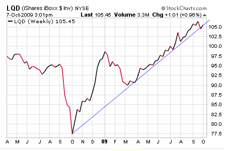 「ここから年末までは、投資家たちは株投資に慎重になるだろう。考えてほしい、もう既に45%も上げてしまったのだから、株が買い難いのは当たり前だ。」 --- アダム・グルド氏(Direxion Funds) 10月と聞くと、暴落を思い浮かべる人たちが多いだけに、どうしても今月は株に対する警戒心が高まってしまう。それに決算シーズンも始まるから、利食えるものは利食っておこう、という気持ちになっても仕方がない。 もちろん、単に嫌な雰囲気だというだけでは、そう簡単に持ち株を処分するわけにはいかない。やはり売るからには、それなりの理由が欲しい。トム・ダイソン氏(dailywealth.com)は、こんなことを語っている。 iShares iBoxx $ Invest Grade Corp Bond (LQD)の上昇が続く限り、株式市場の心配をする必要はない。(注:iShares iBoxx $ Invest Grade Corp Bondは、格付けの高い社債に投資する上場投信。)ほとんどの人たちは、米国経済にとって株式市場の方が債券市場より重要だと思っているが、事実はその反対だ。 先ず、社債市場の規模は株式市場の5倍に相当する。株式市場は、一攫千金を夢見る多数のギャンブラーが集まるが、社債市場を独占するのは洗練された機関投資家たちだ。更に、株式市場の歴史家として有名なラッセル・ナピア氏によれば、社債市場は株式市場よりも数カ月先に動くから、先行指標として利用することができる。 iShares iBoxx $ Invest Grade Corp Bond (LQD) 10月が底打ちだ。現在トレンドラインがテストされ、ダイソン氏は、103ドルを割るようなら要注意だと述べている。 下はS&P500指数だ。 株式市場の底打ちは3月だった。今のところアップトレンドは安泰だ。 (情報源: http://www.dailywealth.com/archive/2009/sep/2009_sep_21.asp ) 株の話、経済の話、何の話だろう? http://kabukeizainani.blogspot.com/