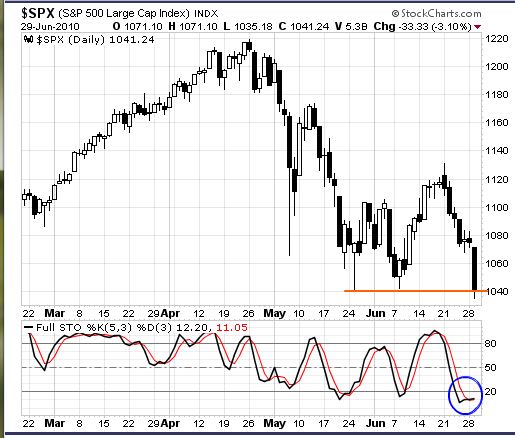 火曜のNY株式市場は3%を超える大幅下落となり、ヘッド・アンド・ショルダーズを気にする人たちが一気に増えた。 ヘッド・アンド・ショルダーズ ・ネックライン割れで空売り ・頭からネックラインまでの長さを測ってターゲットを計算する 下はS&P500指数の日足チャートだ。 もしこれが本当にヘッド・アンド・ショルダーズなら、ターゲットは去年7月の安値付近になる。 こういう見方もできる。 長い陰線が形成されたが、S&P500は何とかサポートラインの上で終了となった。ストキャスティクスは売られ過ぎレベルに入っているから、マーケットは、そろそろ反発の可能性がある。 どちらにしても、マーケットは重要なレベルに達しているだけに、明日の動きが大いに注目される。 ツイッター http://twitter.com/kamada3