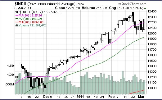長い強い陽線が出来上がった。ダウ指数は2日前の下げを取り戻し、1.59%の大幅上昇で木曜の取引を終了した。予想よりかなり良かった、新規失業保険申請者数が買い材料となったようだ。アナリストたちは、前回の38万8000人から40万人に増えることを予想していたが、実際に発表された数値は36万8000人だった。D.A. Davidson & Coのジョン・ディクソン氏は、これで明日の雇用統計に好結果を期待できそうだ、と語っている。 下が予想されている数値だ。(2月米雇用統計) ・非農業部門就業者数: +18万5000人 ・失業率: 9.1% ・平均労働時間(週):34.3時間 ・時給: +0.2% 下はダウ指数の日足チャートだ。 不安な中東情勢、上昇する原油、と悪材料が出ているが、個人投資家たちの姿勢には極端な変化を見ることはできない。下は、AAIIからの発表だ。 向こう6ヶ月間を考慮した場合、株は上がると答えた強気個人投資家数は0.2ポイント増えて36.8%となった。歴史的平均値は39%であり、これで2週間連続でこの数値を下回った。 向こう6ヶ月間、株はほとんど動くことはない、という中立姿勢を示す投資家数は2.8ポイント上昇して30.1%となった。これは2010年8月12日以来最高の数字だが、歴史的平均値である31%には満たない。 株は下がる、という弱気論者は3ポイント減って33.2%になったが、この数値は歴史的平均値の30%を上回っている。 更に、「最近の中東情勢を考慮して、あなたは投資ポートフォリオの調整をしましたか?」、という質問に対し、ほとんどの投資家は「ノー」と答えている。下は、いくつかの回答だ。 ・投資ポートフォリオに変更はありません。中東情勢は、石油やガソリン関連銘柄に、一時的な影響を与えるだけだと思います。 ・投資計画の変更はありません。中東情勢は、マーケットを一時的に不安定にさせるだけだと思います。 ・これを機会に、原油関連銘柄に更に資金を投入しました。 ・そろそろ引退の年齢ですが、長期的な視野で見ていますから、投資ポートフォリオは調整していません。 (情報源: Dow jumps 190 on jobs data, lower oil AAII Sentiment Survey: Neutral Sentiment Highest in 6 Months) ブレイクアウトが迫る原油ETF http://is.gd/Fyg316