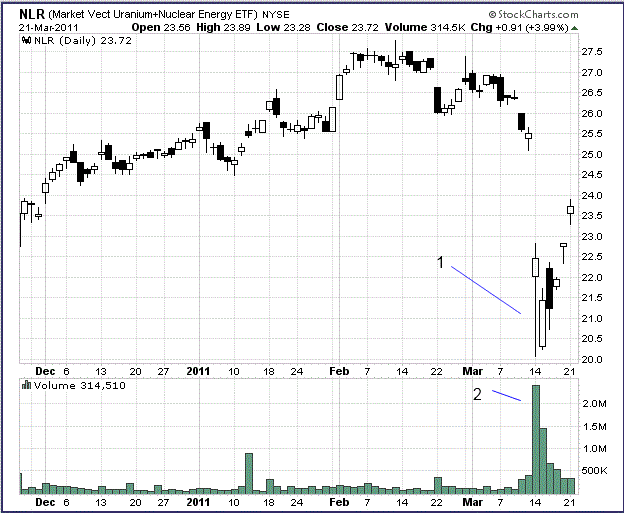 皆さんのお知り合いの中にも、こういうことを言う人がいると思います。「私はニュースなどは一切無視して、チャートだけを頼りに株投資をしている。」簡単なようで、なかなかこれを実行するのは難しいものです。 実例を挙げれば、今回の福島第1原発事故があります。言うまでもなく、世界中のマスコミがこの事故を大々的に取り上げ、原子力に関連した銘柄が大きく売られる結果となりました。下は核エネルギー、原子力発電銘柄に投資している上場投信、Market Vectors Uranium+Nuclear Energy ETF (NLR)の日足チャートです。 1、この日NLRは大きな窓を開けてスタートを切りましたが、最終的に出来上がったのは極めて長い下ヒゲのある陽線です。本当に悪いニュースであるなら、こんな陽線ではなく大陰線ができる筈です。 2、そして出来高も膨大です。正にパニック売りがあっただけでなく、一気に売りが出尽くしてしまった可能性もあります。 というわけで、1と2の理由で、この日のマーケット終了間際にNLRを買った人が結構いたのではないでしょうか。もちろん、繰り返しになりますが、原子力の脅威が徹底的に報道されていましたから、この状況で買うのは極めて困難であったことは事実です。 実際に買っていないのなら、つまらない後講釈はやめてくれ、と憤慨される方々もいることでしょう。もうかなり前になりますが、フィデリティで大口取引を担当していた、ケビン・ハガティ氏と何度か話す機会がありました。 職業上ハガティ氏は毎日ニュースに目を通しますが、「ニュースは小説のようなものだ」、というのが氏の口癖でした。氏のトレードスタイルは、ほぼ100%チャートだけに頼ったもので、ニュースやファンダメンタル要素を使ってトレードすることはありません。 何の銘柄だったかは忘れましたが、「チャート上には、1-2-3ボトムが形成されている」、とハガティ氏に話したら、氏はいきなり大きな声で「Did you take that trade? Did you take it?!」(実際にトレードしたのか?!)と問いかけてきました。 本当に良い勉強になりました。大きな声で怒鳴られ、馬鹿にされた気分になりましたが、ハガティ氏は株はやるものであることを私に教えてくれました。 最後になりましたが、こんなニュースが出ています。「福島第1原発『安定化目前』=外部電源供給は明るい兆し」 さてNLRを買いますか? (情報源:福島第1原発「安定化目前」=外部電源供給は明るい兆し) 週足チャート対日足チャート http://goo.gl/PqEd6