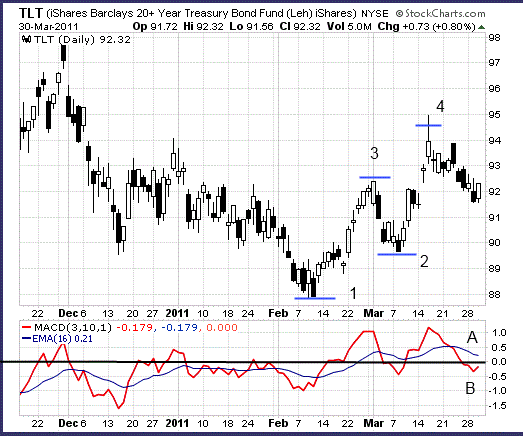 ・ ドルが世界経済を混乱させている。この現状を切り抜けるためには、新しい世界の準備通貨が必要だ。世界の国々は、次々と発行されるドルをストップさせることができない。世界の通貨システムは、安定と公正を欠いている。--- Xu Hongcai氏(中国国際経済交流センター) ・ JPモルガンの推定によれば、地震や津波で大きな被害を受けた日本が回復するためには、日本のGDP6%に相当する約3000億ドルの資金が必要になる。しかしJPモルガンは、日本のV字型の回復を予想している。今年前半、日本の経済はマイナス1%まで落ち込む可能性があるが、今年の後半は+3.5%の大きな成長が見込まれている。--- ジョン・トマス氏(ヘッジファンド・マネージャー) ・ 日本で原発事故があったからといって、石炭と原油の代用になるものがない現在、完全に原子力発電をストップさせることは不可能だ。原油価格は向こう10年にかけて、大幅な上昇となることだろう。 --- ジム・ロジャーズ氏(著名投資家) ・ 住宅ローンの金利を左右する要因は色々とある。最近、住宅ローンの金利が下がっているが、この原因の一つには日本の大地震、津波、原発事故がある。こんな日本の状況を見た投資家たちは、資金を国債へ避難させ、これが住宅ローン金利下降に結びついたようだ。--- ロバート・ラウフ氏(Real Estate Mortgage Network) ここで、米国債に投資をしている上場投信、iShares Barclays 20+ Year Treas Bond (TLT)の日足チャートを見てみよう。 ・ 1、2、3、4で分かるように一段高い安値と高値が形成され、TLTには短期アップトレンドが形成されている。 ・ MACD(パラメーターは3-10-16)のスローライン(A)はゼロラインより上にあり、現在TLTは買い基調にあることが示されている。 ・ 一時的にファストライン(B)はゼロラインを割り、押し目買いのチャンスが訪れていることが表示されている。 (情報源:Jim Rogers: Oil To Rise; Nuclear Energy Will Come Back How Japan’s tsunami lowered your mortgage rate China economist blasts dollar dominance on eve of G20 Japan: Here Comes the "V") 商品市場に投資する定期預金?? ( http://goo.gl/SLWxT)