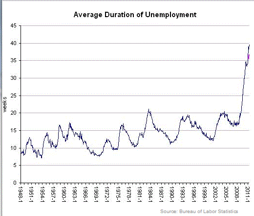 insidermonkey.comがマーク・ファーバー氏をインタビューした。少し抜粋してみよう。 (マーク・ファーバー: スイス連邦チューリッヒ出身の投資アナリスト・投資アドバイザー。Marc Faber Limitedの創業者・社長(Managing Director)。現在はタイ王国在住。1987年のニューヨーク株式市場の暴落を予見・警告していたことで有名になった。 --- ウィキペディアから) insidermonkey.com: オバマ大統領について ファーバー: 米国史上最悪の大統領だ。大統領は、色々な事を約束したが、けっきょく何も起きていない。大統領のお陰で地政学的状況は不安になり、経済は更に悪化した。 insidermonkey.com: 大統領は、まず最初に手がけるべきことをしていないということですか? ファーバー: そのとおり。大統領は優先させるべきことを優先していない。大統領は米国の競争力を高めることに力を入れなければならない。しかし、オバマ大統領の財政政策は政府の影響力を拡大させ、そのため民間セクターの成長に悪影響となっている。私の友人が語っていたが、政府は税金と更なる規制で人々苦しめている。これでは繁栄は望めない。 insidermonkey.com: 次期政権に、どのようなアドバイスをしますか? ファーバー: 私はオバマ大統領は再選されると思う。米国には独裁政治のようなものが存在している。今日の米国は、政府からの施し物を得る人の数が、多くの税金を収める人の数を上回っている状態だ。施し物を求める人々は大きな投票源だ。 下のチャートを見てほしい。 (グラフ:NYタイムズから) 米国の失業率は9.1%だが、上のグラフには、平均的な失業期間の推移が示されている。1948年以来、長くても失業期間は15週間から20週間だったが、今日の平均は39.7週間に跳ね上がっている。言い換えれば、9ヶ月以上も職が見つからないのだから、これでは政府の援助がなければやっていけない。こんな状態だから庶民は腹が立つ。「私たちがこんなに困っているのに、政府は国民の金をつかって、金融危機の犯人である銀行や証券会社を助けてしまった。銀行の経営者たちは今日も高給を得て、毎日快適に暮らしている。」 というわけで、今日のアメリカは労働組合の活動が活発になったと思う。これだけパッとしない経済状態だけに、言うまでもなく、労働組合には絶好のチャンスが到来している。労働組合は庶民の味方だ。労働組合に反対する者はアメリカの敵だ。そんな時代が近々訪れるような気がする。 (情報源: Average Length of Unemployment at All-Time High Marc Faber Interview: Here is What Faber is Bullish About)