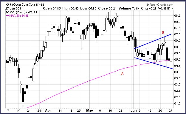 ゴールドマン・サックスのアナリストによれば、現在の経済周期を考慮すると、最も魅力的な銘柄はコカコーラだという。知名度は極めて高い銘柄だがアップルのような派手さが無いから、少しガッカリした投資家もいることだろう。日足チャートを見てみよう。 20日移動平均線(1)、そして50日移動平均線(2)で分かるように、短期と中期トレンドは下げ方向だ。しかし、長期トレンドを示す200日移動平均線(3)は相変わらず上昇が続き、長期的な買い姿勢はまだ崩れていない。 こういう見方をすることもできる。 あまり広く使われている移動平均線ではないが、コカコーラは上昇する150日移動平均線(A)を現在テスト中だ。更に6月に入ってからはメガホンが形成され、ここから反発ラリーが開始されると、メガホンの上辺付近(B)まで上げる可能性がある。(76ドルがゴールドマン・サックスのアナリストの目標株価。月曜の終値は65ドル21セント。) こういう統計もある。そろそろ6月が終わるが、株の成績を月別で見ると、コカコーラにとって6月は9月に次いで成績が悪い。7月は最高ではないが平均で1.35%の上昇率があり、過去49年間を振り返ると、コカコーラが7月に上昇する確率は63%ほどある。(最も好調なのは3月。上昇率は3.2%、そして3月に上がる確率は77%。) ここで質問。「機関投資家で、コカコーラを最も多く所有するのは誰でしょう?」 正解は、著名投資家ウォーレン・バフェット氏が会長を務めるバークシャー・ハサウェイ社。8.7%にのぼるコカコーラ株をバークシャー・ハサウェイ社は保有している。 ウォーレン・バフェット氏 (情報源:GOLDMAN SACHS: THE BEST STOCK AT THIS POINT IN THE CYCLE)