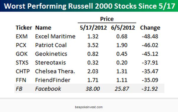 フェイスブックの公募価格が38ドルに決定したのは5月17日だった。今日の終値は25ドル87セントだから、既に31.92%も下げている。下の表はBespoke Investment Groupからのものだ。 5月17日から6月5日までを振り返った場合、Russell 3000指数に属する銘柄で、フェイスブックより成績が悪いのはたった6銘柄しかない。Russell 3000指数は、ほぼ3000の銘柄で構成されているから、99%以上の銘柄がフェイスブックより成績が良かったことになる。 (注: 表にはRussell 2000と記されているが、説明を読むとRussell 2000ではなくRussell 3000と記されている。) (情報源:Stocks Worse Than Facebook) 一足先に持ち株を処分していた最高経営責任者 -- Facebook( http://kabukeizainani.blogspot.com/2012/06/facebook.html)