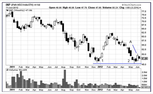 [ムンバイ 11日 ロイター] 米格付け会社スタンダード・アンド・プアーズ(S&P)がインドについて、BRIC(ブラジル、ロシア、インド、中国)の中で最初に投資適格級の格付けを失う恐れがあると警告したことを受け、インドルピーは下落し、同国株式相場はそれまでの上げ幅をほぼ解消している。 下はインド株専門のETN、iPath MSCI India Index ETN (INP)の日足チャートだ。 一番右側のローソク足で分かるように、INPは3%を超える下げとなり、ほぼ今日の安値で終了となった。右下がりの冴えないチャートだが、次に週足チャートを見てみよう。 先週、長い目立つ陽線(A)が形成された。1、2で分かる分かるように、二番底だと判断した人たちが買ったと思われる。しかし、今日のニュースで早速売られ、サポートライン(青い横線)が再テストされる可能性が出てきた。サポートライン割れは売りを意味するだけに、積極的な買い手が現れるかに注目したい。 (情報源:S&Pがインド投資適格級格付けについて指摘、株価にも影響)
