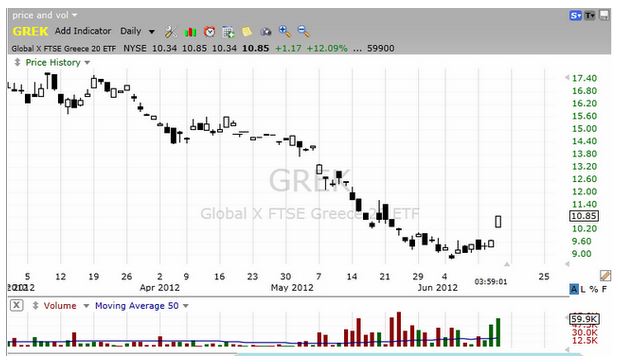 今週末に再選挙が迫ったギリシャ。 http://youtu.be/bu1EpV5FxfU 株の方は上放れだ。 ギリシャ株専門のETF、Global X FTSE Greece 20 (GREK)の日足チャート。 窓を開けてのスタート、そして12%を超える大幅上昇で14日の取引を終了だ。