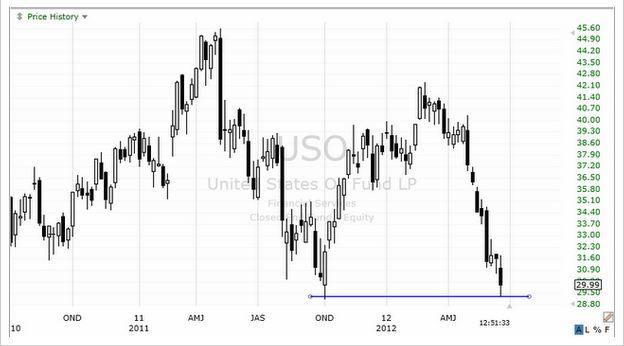 原油が80ドルを割った、と話題になっています。下は、原油価格に連動する上場投信United States Oil Fund (USO)の週足チャートです。(金曜のマーケット終了3時間半前時点) ひょっとすると二番底かもしれない、去年10月の安値がサポートになった可能性がある、といった程度の判断をすることができます。もし反発が起きた場合、どのあたりまで株価は上げるでしょうか?下は日足チャートです。 先ず指摘したいのはダイバージェンスです。株価の動きとは反対にMACDのヒストグラムは既に上昇が始まり、反発ラリーの可能性が示唆されています。もちろん、ヨーロッパ情勢、中国経済などを考慮すると、あまり大した反発ラリーは期待できないと思います。 最近の様子を見てみると下降する10日移動平均線がレジスタンスになっています。言い換えると、10日移動平均線付近には売り手が待っていると思われます。