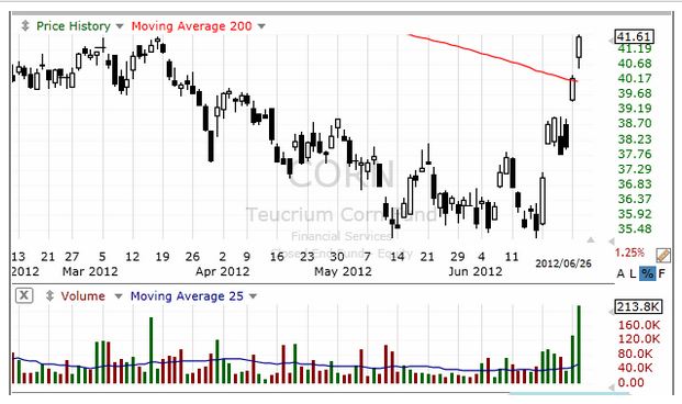 鶏肉で知られるサンダーソン・ファームズ(SAFM)が6%を超える大幅下落となった。 極めて長い陰線を形成し、長期トレンドを把握するために広く活用されている200日移動平均線を決定的に割っての終了だ。これだけ派手に下げたのだから何かニュースがあるだろう、と思って調べてみると、急騰するトウモロコシ価格が下げの一因になったようだ。 鶏を育てるためには飼料が必要になる。飼料になるのはトウモロコシだが、hedgeye.comのキース・マカルー氏はこうツイートしている。 トウモロコシの値段が跳ね上がる前まではサンダーソン・ファームズは買い銘柄の一つだった。 更に調べてみると、一年前の話になるが、大幅に上昇する飼料価格がサンダーソン・ファームズの利益にかなりの打撃を与えたようだ。トウモロコシのETF、Teucrium Corn (CORN)の日足チャートを見てみよう。 下降する200日移動平均線を大きく突破しての終了だ。出来高も大きい。猛暑の天気予報が買い材料になり、ここ2週間で17%も上げている。 上のチャートにオン・バランス・ボリュームを入れてみよう。先ずサンダーソン・ファームズ。 売り圧力、買い圧力を見るための一方法としてオン・バランス・ボリュームは使われているが、先週金曜にサポートラインを既に割っていた。株価が200日移動平均線を大きく割ったのは今日だから、オン・バランス・ボリュームは株価より一足先に動いていたことになる。ボリュームは出来高という意味だが、出来高は株より先に動く、と信じている人も多い。 トウモロコシのETFに移ろう。 先週火曜にレジスタンスラインを突破している。 もちろん、オン・バランス・ボリュームがいつも先に動くとは限らない。しかし、ブレイクアウトの警報になることもあるだけに、時々見ることを勧めたい指標だ。 (情報源:Three Winners Nobody Sees Coming: SAFM, CORT, SCLN Crop Progress: Corn Conditions Dangerously Low)