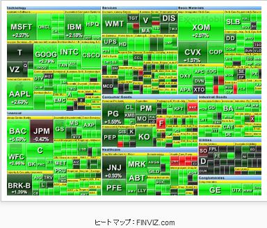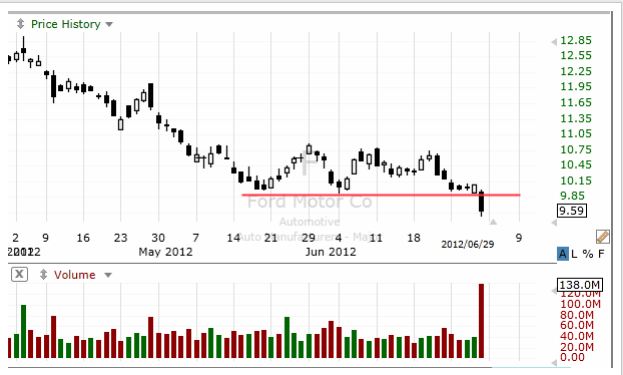 ダウは+2.2%、S&P500は+2.49%、そしてナスダックは+3.00%、主要株式指数は大幅上昇だ。 買い材料はこれ: 米国株、大幅反発 欧州合意を好感 ダウ1カ月半ぶり高値 ユーロ圏首脳が金融安全網から民間銀行に資本を直接注入できる仕組みで合意し、欧州債務問題の解決に向けて前進したとの見方が浮上。投資家が運用リスクを取る動きを強め、幅広い銘柄に買いが入った。(日本経済新聞) ほぼ全面グリーン、下げを示す赤はポツンポツンとあるだけだ。 上はフォード・モーターの日足チャート。海外での売上が予想以上に悪いというニュースが売り材料になり、4.96%の大幅下落となった。膨大な出来高を伴ってサポートラインを割っての終了だが、次に月足チャートを見てみよう。 もしAB = CD のパターンが形成されているとすると、目標株価は3ドル13セント付近になる。(今日の終値は9ドル59セント) (情報源:米国株、大幅反発 欧州合意を好感 ダウ1カ月半ぶり高値 Ford Says Operating Profit Substantially Lower In Quarter)