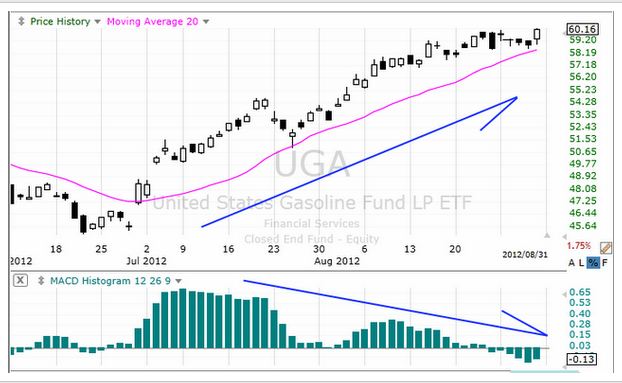 アメリカはハリケーンの影響で、94%の石油生産と65%の天然ガス生産がストップしてしまった。お陰でガソリンの値段も上昇し、米国8月のガソリン平均価格は9.4%の跳ね上がりとなった。オイル・プライス・インフォメーション・サービスのアナリスト、トム・クロザ氏は、こう語っている。 ガソリンが上昇した理由として先ずあげられるのはシェブロン石油精製所の火事、そしてハリケーン・アイザックがある。更に、海外からの要因では、ヨーロッパ・ソブリン債危機がやや和らいだこと、それにイランの原子力プログラムなどもある。しかし、ガソリン価格は、そろそろ下落が始まることだろう。ハリケーン・アイザックの被害は予想されたほど大きくないこと、それにヨーロッパの経済問題がまた台頭してくることが考えられるから、ガソリン価格は思っているより早く下げに転じるだろう。 ガソリンのETF、United States Gasoline (UGA)の日足チャートを見てみよう。 6月に底を打って以来、株価の方は30%を超える上昇となり、わずかではあるが金曜United States Gasoline (UGA)は高値を更新(1)して終了となった。さて、株価は今後も大きく伸びて行くだろうか、それともクロザ氏の言うように「思っているより早く下げが始まる」のだろうか? 二本の矢印の方向で分かるように、MACDのヒストグラムは既に下げが始まり、ダイバージェンスという警報が出ている。もちろん、ただこれだけの理由でこのETFを空売ることはできないが、ここからの買いは慎重に行きたいと思う。 (参照したサイト:ハリケーンの影響で石油生産の94%が停止=米政府 Record Labor Day gas prices won't last)