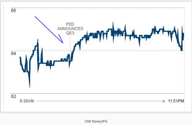 大統領選挙は11月、intrade.comによれば、オバマ氏が再選される確率は67.3%だ。 intrade.comは一種のギャンブル・サイトだ。その他にも、次のマサチューセッツの選挙では共和党が勝利するだろうか、などといった様々な事柄に賭けることができる。 さて、オバマ氏に話を戻すが、CNNにはこんなチャートが掲載されている。 矢印の部分が量的緩和第3弾(QE3)が発表された時間だ。このチャートはオバマ氏の再選の確率を示したものだが、見てのとおり、QE3の発表直後に跳ね上がっている。 オバマ氏がバーナンキ議長に圧力をかけて、このQE3を実施させたかどうかは分からないが、お陰で株式市場は大きく上昇した。言い換えれば、このまま株高が選挙まで続けばオバマ氏の再選は実現しそうだ。 オバマ殿、バーナンキ氏の方へ足を向けて寝てはいけませんぞ。 (参照したサイト:intrade.com Intrade: Fed helped Obama's re-election odds)