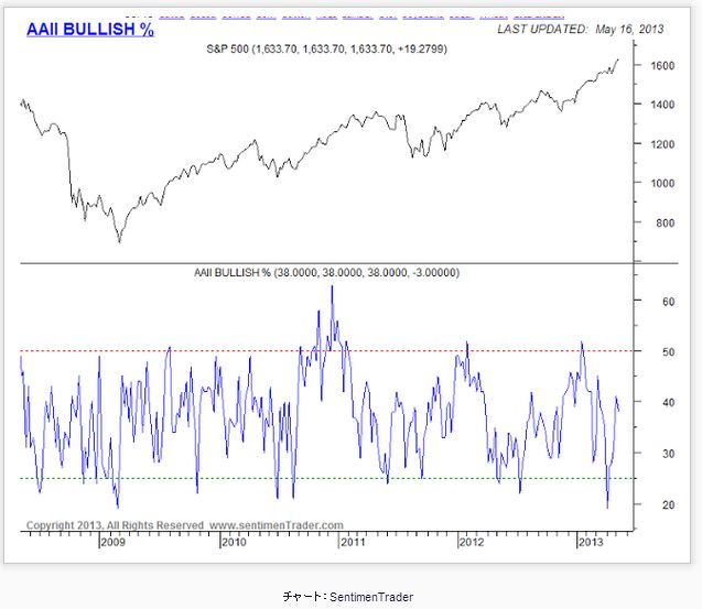 2012ǯ12·î31Æü¡¢S&P500»Ø¿ô¤Î½ªÃͤÏ1426.19¤À¤Ã¤¿¡£Àè½µ¶âÍˤνªÃͤÏ1667.47¤À¤«¤é¡¢S&P500»Ø¿ô¤Ï16.9¡ó¤Î¾å¾º¤À¡£ ¥¢¥Ê¥ê¥¹¥È¤¿¤Á¤Ï¡¢2013ǯ¤Î¥Þ¡¼¥±¥Ã¥È¤ò¡¢¤É¤¦Í½ÁÛ¤·¤Æ¤¤¤¿¤Î¤À¤í¤¦¤«¡©²¼¤Ï¡¢Âç¼ê¶âÍ»µ¡´Ø¤Î¥¢¥Ê¥ê¥¹¥È¤¬È¯É½¤·¤¿¡¢º£Ç¯¤ÎS&P500»Ø¿ô¤ÎÌÜɸÃͤÀ¡£¡Ê¿ôÃͤϡ¢2013ǯ¤ÎS&P500»Ø¿ô¤Î½ªÃͤòͽÁÛ¤·¤¿¤â¤Î¡£¡Ë À褺¡¢°ìÈÖ¾å¤ÎWells Fargo¤ò¸«¤Æ¤ß¤è¤¦¡£1390¤È¤¤¤¦¼åµ¤¤ÊͽÁÛ¤À¡£¤³¤ÎͽÁÛ¤¬ÅªÃ椹¤ë¤¿¤á¤Ë¤Ï¡¢S&P500»Ø¿ô¤Ï¡¢¶âÍˤνªÃͤ«¤é16¡ó¤Û¤É²¼Í¤ëɬÍפ¬¤¢¤ë¡£ ºÇ¤â³Ú´ÑŪ¤ÊÌÜɸÃͤòȯɽ¤·¤¿¤Î¤ÏCiti¤Î¥¢¥Ê¥ê¥¹¥È¤À¡£Í½ÁÛ¤µ¤ì¤ëº£Ç¯¤Î½ªÃͤÏ1615¤À¤«¤é¡¢S&P500»Ø¿ô¤Ï´û¤ËÌÜɸ¤Ë㤷¤Æ¤¤¤ë¡£¸À¤¤´¹¤¨¤ë¤È¡¢Citi¤Î¥¢¥Ê¥ê¥¹¥È¤Î¸«Êý¤¬Àµ¤·¤¤¾ì¹ç¤Ï¡¢º£Ç¯¸åȾ¤Î¥Þ¡¼¥±¥Ã¥È¤ÏÎɤ¯¤Æ²£¤Ð¤¤¤À¡£ ¥¢¥Ê¥ê¥¹¥È¤¿¤Á¤ÎͽÁÛÊ¿¶ÑÃÍ¡ÊAVERAGE¡Ë¤Ï1534¤À¡£¤³¤ÎͽÁÛ¤¬¼Â¸½¤¹¤ë¤¿¤á¤Ë¤Ï¡¢¶âÍˤνªÃͤ«¤éS&P500»Ø¿ô¤Ï8¡ó¤Û¤É²¼¤²¤ëɬÍפ¬¤¢¤ë¡£ ¥Ó¥¸¥Í¥¹¡¦¥¤¥ó¥µ¥¤¥À¡¼¤Ï¤³¤¦½ñ¤¤¤Æ¤¤¤ë¡£ º£Ç¯¤ËÆþ¤Ã¤Æ¤«¤é¡¢¥¢¥Ê¥ê¥¹¥È¤¿¤Á¤Ï¹Í¤¨¤òÊѤ¨¡¢¼¡¡¹¤ÈͽÁÛÃͤÎÊѹ¹È¯É½¤À¡£¤â¤Á¤í¤ó¡¢Í½Áۤɤª¤ê¥Þ¡¼¥±¥Ã¥È¤ÏºÇ½ªÅª¤Ë²¼¤²¤ë¡¢¤È°Õ¸«¤òÊѤ¨¤Ê¤¤¥¢¥Ê¥ê¥¹¥È¤â¤¤¤ë¡£¤É¤Á¤é¤Ë¤·¤Æ¤â¡¢¥¢¥Ê¥ê¥¹¥È¤Î°Õ¸«¤ò»²¹Í¤ËÅê»ñ¤·¤Æ¤¤¤¿¸Ä¿ÍÅê»ñ²È¤¿¤Á¤â°Õ¸«¤Î½¤Àµ¤¬É¬ÍפÀ¡£¡ÊÎ㤨¤Ð¥´¡¼¥ë¥É¥Þ¥ó¡¦¥µ¥Ã¥¯¥¹¤Ï¡¢Í½ÁÛÃͤò1575¤«¤é1625¤Ë¾åÊý½¤Àµ¤·¤Æ¤¤¤ë¡£¡Ë ¼¡¤Ë¡¢Ëè½µAAII¤«¤éȯɽ¤µ¤ì¤ë¡¢¸Ä¿ÍÅê»ñ²È¤¿¤Á¤Î¶¯µ¤¥»¥ó¥Á¥á¥ó¥È¤ò¸«¤Æ¤ß¤è¤¦¡£ ²¼È¾Ê¬¤¬¶¯µ¤¥»¥ó¥Á¥á¥ó¥È¡Ê5·î16Æü»þÅÀ¡Ë¤À¡£º£²ó¤Î¿ôÃͤÏ38¡ó¤È¤Ê¤ê¡¢¾å¾º¤¹¤ë¥Þ¡¼¥±¥Ã¥È¤È¤ÏÈ¿ÂФˡ¢Á°²ó¤Î41¡ó¤«¤é3¥Ý¥¤¥ó¥È²¼¤¬¤Ã¤Æ¤¤¤ë¡£¤È¤¤¤¦Ìõ¤Ç¡¢¥Þ¡¼¥±¥Ã¥È²áÇ®¤ò¼¨¤¹50¡ó¤Ë㤹¤ë¤³¤È¤Ê¤¯¶¯µ¤¥»¥ó¥Á¥á¥ó¥È¤Ï²¼¤¬¤Ã¤Æ¤·¤Þ¤Ã¤¿¡£Îɤ¯²ò¼á¤¹¤ì¤Ð¡¢¸Ä¿ÍÅê»ñ²È¤¿¤Á¤ÏÎäÀŤÀ¡£ ¡Ê»²¾È¤·¤¿¥µ¥¤¥È¡¿µ»ö¡§ Literally Every Strategist On Wall Street Has Been Wrong About The Stock Market WALL STREET: Here's What The S&P 500 Will Do This Year SentimenTrader¡Ë