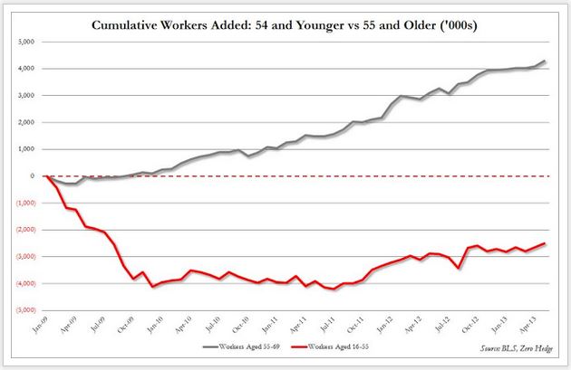 金曜に発表された米国5月の非農業部門就業者数は、予想されていた16.9万人増を上回る17.5万人増という結果だった。景気回復は引き続き順調に進んでいる、ということになるらしいのだが、いったいどんな仕事が増えているのだろうか。 増加が目立ったのはレストラン(+38,100人)、小売業(+27,700人)、一時雇用(+35,600人)の3分野になり、それらを合計すると5月の雇用増加の半分以上となる。これらの業種は一般的に給料が低く、このような仕事が増えているということは労働市場が弱いということだ。もちろん、どんな時代にも給料の低い仕事は存在する。しかし労働市場が強い状態なら、人々は給料の安い仕事を避ける。 -- ディーン・ベイカー氏(経済ポリシー・リサーチ・センター) こういう内容の記事も多い。 今回の雇用統計には好材料も含まれている。例えば、失業率は前回の7.5%から7.6%に上昇しているから、心配されている量的緩和の早期終了の可能性が無くなった。 極めて簡単に今日のアメリカの世論をまとめると、「景気の回復が順調に進んでいるのは良いことだが、まだ強さが見られない。出口模索などしないで、量的緩和策は現状どおり続けるべきだ」、ということになる。 もちろん、こういう少数意見もある。 自分たちの言っていることが分かっていない。失業率が上昇したから、これで現状どおり量的緩和策が継続されそうだというのが、なぜ好材料なのだろうか。これは失業率の上昇を喜んでいるのと同じであり、失業者数が更に増えることを望む態度にも見える。 -- ジョシュア・ブラウン氏(投資アドバイザー) 失業率が深刻なのは若い世代だ。 特に16歳から24歳までの黒人の失業率が高い。5月の失業率は28.2%となり、4月の24.9%を上回った。(Forbes誌) これと対照的なのが55歳から69歳までの人たちだ。 順調に株価は上昇中といった様相だが、このチャートには55歳から69歳までの人たちの雇用レベルが示され、中高齢労働者数が年々増えている。若い世代が仕事が見つからないのは高齢者が悪い、と単純に結論する人もいるが、見方を変えれば今日のアメリカ社会では、50代で退職するのは夢のような話であり、そんな年代で仕事を辞めたら食べていけないということが示唆されている。 zerohedge.comには、もう一つこういうチャートがある。 就業者数の増加状況が示されている。黒い線は55歳以上の人たち、そして赤い線は54歳以下の人たちの様子だ。見てのとおり、黒い線は上昇しているが、赤い線は0未満で推移している。明らかに、米国労働市場は高齢化し、若い世代は職探しに苦労しているようだ。 (参照した記事:The Unemployment News Is Worse For Many Waiter and waitress nation: The May payrolls report shows the US creating jobs, just not many good ones Number Of Older Workers (55 And Over) Rises To New Record High)