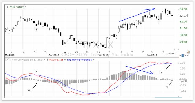 今朝のツイートで面白いと思ったのはこれです。 ライアン・デトリック氏は、シェイファーズ・インベストメント・リサーチのストラテジストです。「今日、TLTのMACDのヒストグラムが0を超えた。3月19日に同様なことが起き、TLTの価格は素早く117から122.8へ上昇した」、という意味になります。TLTというのは米国の長期国債に投資しているETFのことで、下が日足チャートです(金曜のマーケット終了1時間半前時点)。 1で分かるように、MACDのヒストグラムは0ラインを越えて、確かにプラスに転換しています。それに、MACDはシグナルラインをクロスして(2)買いシグナルも出ています。 3は同様なことが起きたという3月19日です。ヒストグラムはプラスに変わり(4)、そしてゴールデン・クロス(5)の買いシグナルも見えます。 もう一つ指摘したいのはダイバージェンスです。二本の矢印を見てください。ETFの価格は下げ方向ですが、MACDのヒストグラムは既に上昇が始まり、底が形成されている可能性が示されています。 TLTが下落する局面では国債の利回りが上昇し、その反対にTLTが上昇する局面では国債の利回りが下がります。下は、米長期国債の利回りを示すチャートです。 ヒストグラムはプラスで推移していましたが、今日マイナスに転落です(1)。MACDはシグナルラインを上から下へクロスして、売りシグナルが出ています(2)。 3は3月19日です。MACDのヒストグラムは0ラインを割り(4)、デッドクロスの売りシグナルも発せられています(5)。 矢印を見てください。ダイバージェンスが起きています。ETF価格の上昇とは反対にヒストグラムは下げ始め、天井が形成されている可能性が示唆されています。 ということで、上二つのチャートから判断できることは、米長期国債には現在買いシグナルが点滅し、更に上昇が続いていた利回りは下げに転じるということです。言い換えると、短期的には国債ラリーが起きそうな様相です。 では、もしここから長期国債(TLT)が買われた場合、どのあたりまで上昇するでしょうか。下は週足チャートです。 見てのとおり、下降するチャンネル内での動きが続いています。下辺がサポートになり、今週のローソク足(一番右)は陽線です。ここから反発ラリーが開始されると、ご察しのとおり、目標はチャンネルの上限です。しかし、下降するチャンネルですから、前回の高値を突破するのは無理そうです。 もちろん、上限に達すると、それは売りシグナルですから国債が売られることになります。そして売られた場合は、下降するチャンネルの下辺が目標値ですから、国債価格は今回の安値を割ることになります。言い換えると、国債利回りは今日のレベルより高くなるわけです。 国債の利回りについて、ジム・オニール氏(前ゴールドマン・サックス・アセット・マネージメント会長)は、こう述べています。 国債利回りの正常化ということを考えると、米国債(10年物)は現行の約2.2%から4%台へ上昇することになるだろう。これが意味することは、長期間に渡って続いた国債への投資熱が冷え込み、株が見直されるということだ。 (参照した記事:デトリック氏のツイート JIM O'NEILL: We Could See A Bond Crash)
