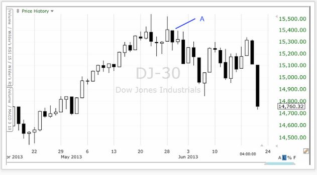 ツイートだけから判断すると、今日のマーケットの大幅下落は「バーナンキFRB議長が悪い」、ということになります。既に報道されているように、昨日の記者会見でバーナンキ氏は量的緩和縮小は年内に実施することが適切という見方を表明しただけでなく、証券購入は来年中に終了させたいという考えも述べ、投資家たちは超低金利政策は確実に終わったと判断しました。 ここで思い出したのは、5月29日のUSA TODAYの第一面です。 Bull run gets solid footing、という大きな見出しですが、これは「ブルマーケットは極めて堅固である」、といった意味になります。「新聞の見出しは良い逆指標になる」、というのが通念ですから、この日は「マーケットは天井だ」のツイートで溢れました。 下はダウ指数の日足チャートです。 Aが5月29日、記事が発表された日になります。更に言えば、この日はダウ指数が史上最高値を記録した翌日です。特に今日の下げが厳しかっただけに、USA TODAYの記事は、正に逆指標の名にふさわしい絶妙なタイミングで発表されたとしか言いようがありません。 今日の大幅下落で気になることをいくつかあげてみたいと思います。 先ず、今日のローソク足は、50日移動平均線(1)を決定的に割っています。多くの人たちは、50日移動平均線割れは売りシグナルと解釈していますから、このブレイクダウンで空売りを考える人が急増したことでしょう。 サポートライン(2)も崩れています。特にBの安値を割ったことで、AB=CDのパターンが形成されそうな様相となっています。このまま下落が続くと、目標値のDには、あと160ポイントほどで到着です。更に、Bの安値割れでダウ指数は一段低い安値を記録し、短期トレンドが上げから下げに変わっています。 もう一つ注意したいのは、いったん崩れたサポートはレジスタンスになる可能性があるということです。ですから、もしマーケットが反発して2まで戻ると、そこには売り手が待っていることが十分に考えられます。 もちろん、今日の下げで次の買いチャンスが近くなった、という意見もあります。 上のチャートには、米国株式市場で取り引きされている株の何パーセントが40日移動平均線より上にあるかが示されています。注目は円で囲った二つの部分です。両方に共通しているのは20%割れであり、その時マーケットは底の形成中でした。言い換えると、両方とも良い買い場になったということです。 矢印を入れましたが、今日の数値は21%です。そろそろ20%を割りそうな状態ですから、買い準備をしている人もいることでしょう。参考までに記すと、一番左の円では16.31%で底打ちとなり、二番目の円では17.34%で底打ちです。