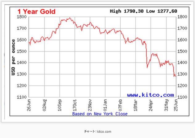 今日の単語:obsolete(時代遅れの、旧式の、もう使われていない、廃れた、陳腐な、陳腐化した) UBSのアナリストが、向こう12カ月間の金の目標価格を1750ドルから1050ドルに引き下げた。理由は金がobsoleteになってしまったからだ。 2012年終了までの3年間、量的緩和政策に対する保険として金が買われ、年間平均で金は17.4%の上昇となった。しかし今日、連銀は米国経済が下向きになる危険が無くなったという見方を明らかにし、今年中に量的緩和の縮小に踏み切る可能性が高くなった。投資家たちは、金の量的緩和政策に対する保険としての役目は終わった(obsolete)と判断し、金は敬遠されることになるだろう。-- ドミニク・シュナイダー氏(UBS) ここ一年間の金の動きを見てみよう。 明らかなダウントレンドだ。現在の価格は1オンス1228ドル80セントだから、去年9月の高値1790ドル30セントから31%も下げている。 金に対して弱気な見方をしているのは上記したUBSだけでなく、ゴールドマン・サックス、それにモルガン・スタンレーも目標価格を引き下げている。大手金融機関のアナリストが金を避けろ、と警報を出しているのだから、その意見に従う個人投資家はかなり多いことだろう。 上のチャートは、6月25日時点における個人投資家たちの金に対する強気センチメントだ。円で囲った部分に注目してほしい。29.37%という極めて低いレベルに落ち込み、投資家たちは正に降参といった状態だ。 アナリストも弱気、個人投資家も弱気ということで両者の意見が一致している。ここで疑問になることは、皆が皆弱気なのだから、ほとんどの人たちは金を売ってしまったのではないだろうか?言い換えると、そろそろ金は買いチャンスではないだろうか?今朝のブログで、J.C.パレッツ氏はこう書いている。 下は金(先物)の週足チャートだ。 見てのとおり、4月の急落に続き、金は三角形の底辺を割った。ここが底だろうか?その可能性があるかもしれないが、私にはここが底だとは思えない。2008年の安値から線を引いてフィボナッチの値戻しレベルを入れると、1150ドル台が61.8%の値戻しレベルになる。更に1150ドル台は、2011年から2013年の長期にかけて形成された天井を考慮して計算した下げ目標値とも一致するから、買い出動するなら1150ドル台だと思う。 (参照した記事:UBS Says QE's End May Render Gold 'Obsolete' Morgan Stanley to Goldman Cut Gold Forecasts on Fed Outlook If this is the Gold Bottom, it’s Totally Random)
