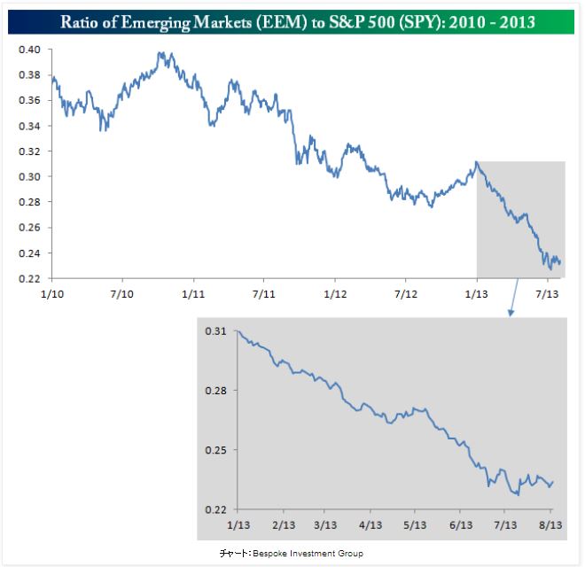 ¡¦ ¹¥Ä´¤ÊÊÆ¹ñ³ô¼°»Ô¾ì¤À¤¬¡¢¤³¤Î¾å¾º¤Ö¤ê¤Ï¡¢¤¢¤Þ¤ê¤Ë¤â¸½¼ÂÎ¥¤ì¤·¤¿¤â¤Î¤Ë¤Ê¤Ã¤Æ¤¤¤ë¡£´Î¿´¤Ê´ë¶ÈÍø±×¤Ï¡¢¸½ºß¤Î³ô²Á¤ËÄɤ¤¤Ä¤¤¤Æ¤¤¤Ê¤¤¡£-- ¥Ö¥é¥Ã¥É¡¦¥Þ¥¯¥ß¥é¥ó»á¡Ê¥³¥â¥ó¥¦¥§¥ë¥¹¡¦¥Õ¥¡¥¤¥Ê¥ó¥·¥ã¥ë¡Ë ¡¦ º£¤Ï°Â¿´¤·¤Æ¤¤¤ë»þ¤Ç¤Ï¤Ê¤¤¡£ºÄ·ô¤è¤ê³ô¤ÎÊý¤¬³ä°Â¤À¡¢¤È¤¤¤¦Íýͳ¤À¤±¤Ç³ô¤òÇ㤦¤Î¤Ï´í¸±¤À¡£¥Ö¥ë¥Þ¡¼¥±¥Ã¥È¤¬»Ï¤Þ¤Ã¤Æ°ÊÍè¡¢¥Þ¡¼¥±¥Ã¥È¤Ï´û¤Ë150¡ó¤â¾å¤¬¤Ã¤Æ¤¤¤ë¡£º£¤ÏÇ㤤¤ò¹Í¤¨¤ë»þ¤Ç¤Ï¤Ê¤¤¡£-- ¥Þ¡¼¥¯¡¦¥È¥é¥Ó¥¹»á¡Ê¥¤¥ó¥È¥ì¥Ó¥Ã¥È¡¦¥¥ã¥Ô¥¿¥ë¡Ë ¡¦ ºÇ¶á2ǯ´Ö¤ò¿¶¤êÊ֤äƤߤë¤È¡¢¿·¶½»Ô¾ì¤ÎÄã̤¬ÌÜΩ¤Ä¡£²¼¤Î¥Á¥ã¡¼¥È¤Ï¡¢S&P500»Ø¿ô¤ËϢư¤¹¤ë¾å¾ìÅê¿®¤È¿·¶½»Ô¾ì¤Î³ô¤ËÅê»ñ¤·¤Æ¤¤¤ë¾å¾ìÅê¿®¤òÈæ¤Ù¤¿¤â¤Î¤À¡£Àþ¤Î¾å¾º¤Ï¡¢¿·¶½»Ô¾ì¤¬S&P500»Ø¿ô¤è¤êÀ®ÀÓ¤¬Îɤ¤¤³¤È¤ò¼¨¤·¡¢Àþ¤Î²¼¹ß¤Ï¿·¶½»Ô¾ì¤ÎÀ®ÀÓ¤¬S&P500»Ø¿ô¤è¤ê°¤¤¤³¤È¤òɽ¤¹¡£¥Á¥ã¡¼¥È¤Çʬ¤«¤ë¤è¤¦¤Ë¡¢Á´ÂÎŪ¤Êή¤ì¤Ï¡¢¿·¶½»Ô¾ì¤ÎÃ٤줬ÁêÊѤï¤é¤ºÌÜΩ¤Ä¡£¤·¤«¤·ºÇ¶á¤ÎÍͻҤò¸«¤Æ¤ß¤ë¤È¡¢³¥¿§¤ÎÉôʬ¤Çʬ¤«¤ë¤è¤¦¤Ë¡¢Àþ¤Îư¤¤Ï¿åÊ¿¤Ë¤Ê¤ê¿·¶½»Ô¾ì¤¬°ÂÄꤷ¤Æ¤¤¿¤è¤¦¤À¡£-- (Bespoke Investment Group) ¡¦ ¥ä¥Õ¡¼¡¦¥Õ¥¡¥¤¥Ê¥ó¥¹¤Î¥ª¥ó¥é¥¤¥ó°Õ¸«Ä´ºº ¼ÁÌä¡§ ¶âÍˤËȯɽ¤µ¤ì¤¿ÊƸÛÍÑÅý·×¤Ë¤ÏÊ£»¨¤Ê¾õ¶·¤¬È¿±Ç¤µ¤ì¤Æ¤¤¤Þ¤·¤¿¤¬¡¢¤¢¤Ê¤¿¤Ï¡¢¤³¤ì¤«¤é¤Î¸ÛÍѾõ¶·¤Ï¤É¤¦¤Ê¤ë¤È»×¤¤¤Þ¤¹¤«¡© ²óÅú¡§ Îɤ¤Êý¸þ¤Ë¸þ¤«¤¦¤È»×¤¦ 23¡ó¡Ê²óÅú¿ô 20999¡Ë Â礷¤¿ÊѲ½¤Ïµ¯¤¤Ê¤¤¤È»×¤¦ 32¡ó¡Ê²óÅú¿ô 28917¡Ë ¸ÛÍѾõ¶·¤Ï°²½¤¹¤ë¤È»×¤¦ 45¡ó¡Ê²óÅú¿ô 40785¡Ë ¡Ê»²¾È¤·¤¿µ»ö¡¿¥µ¥¤¥È¡§Can stocks avoid their annual summer swoon? Record earnings struggle to support record stocks Emerging Markets Stabilizing¡Ë