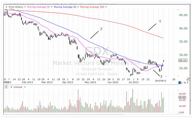 ¶â¹Û³ô¤ÎETF¤¬»°Ï¢¾¡¤Ç¤¹¡£¡Ö¤³¤ì¤Ïñ¤Ê¤ë°ì»þŪ¤Ê¾å¾º¤Ë¤¹¤®¤Ê¤¤¡£Ä¹´üŪ¤Ê¥À¥¦¥ó¥È¥ì¥ó¥É¤ËÊѲ½¤Ï̵¤¤¤Î¤À¤«¤é¡¢¤½¤í¤½¤í¶õÇä¤ê¤Î¥Á¥ã¥ó¥¹¤À¡×¡¢¤È¤¤¤¦°Õ¸«¤¬¼çή¤Ç¤¹¤¬¡¢¡Ö¤Ò¤ç¤Ã¤È¤¹¤ë¤ÈÄìÂǤÁ¤«¤â¤·¤ì¤Ê¤¤¡×¡¢¤È¤¤¤¦À¼¤âʹ¤«¤ì¤Þ¤¹¡£²¼¤Ï¶â¹Û³ô¤ÎETF¡¢Market Vectors Gold Miners (GDX)¤ÎÆüÂ¥Á¥ã¡¼¥È¤Ç¤¹¡£ 1¡¢²¼¹ß¤¹¤ë200Æü°Üưʿ¶ÑÀþ¡§ Ĺ´ü¥È¥ì¥ó¥É¤Ï¥À¥¦¥ó¥È¥ì¥ó¥É 2¡¢²¼¹ß¤¹¤ë50Æü°Üưʿ¶ÑÀþ¡§ Ãæ´ü¥È¥ì¥ó¥É¤Ï¥À¥¦¥ó¥È¥ì¥ó¥É 3¡¢¾å¾º¤¹¤ë20Æü°Üưʿ¶ÑÀþ¡§ û´ü¥È¥ì¥ó¥É¤Ï¥¢¥Ã¥×¥È¥ì¥ó¥É û´ü¥È¥ì¥ó¥É¤Ë¶¯¤µ¤¬¸«¤¨¤ë¤è¤¦¤Ë¤Ê¤ê¤Þ¤·¤¿¤¬¡¢Á´ÂÎŪ¤Êή¤ì¤ÏÁêÊѤï¤é¤º¥À¥¦¥ó¥È¥ì¥ó¥É¤Ç¤¹¡£¤·¤«¤·¡¢Ç㤤¼ê¤Î´üÂÔ¤·¤Æ¤¤¤ë1-2-3¥Ü¥È¥à¤Î²ÄǽÀ¤Ï¤¢¤ê¤Þ¤¹¡£ 2¤Î¹âÃÍÆÍÇˤ¬Ç㤤¥·¥°¥Ê¥ë¤Ë¤Ê¤ê¡¢ÌÜɸ¤Ï¥®¥ã¥Ã¥×¡ÊÁë¡Ë¤Î²¼¸Â¡Ê4¡Ë¡¢30¥É¥ë50¥»¥ó¥ÈÉÕ¶á¤Ç¤¹¡£º£¤Þ¤Ç¤Îư¤¤Çʬ¤«¤ë¤è¤¦¤Ë¡¢¥®¥ã¥Ã¥×¤Î²¼¸Â¤Ï¥ì¥¸¥¹¥¿¥ó¥¹¤Ë¤Ê¤Ã¤Æ¤¤¤Þ¤¹¤«¤é¡¢30¥É¥ë50¥»¥ó¥È¤¢¤¿¤ê¤Ç¤Ï¡¢¤«¤Ê¤ê¤Î¶õÇä¤ê¤¬Í½ÁÛ¤µ¤ì¤Þ¤¹¡£¤È¤¤¤¦¤³¤È¤Ç¡¢Çä¤ê¼ê¤ËÂ礤ʥÀ¥á¡¼¥¸¤òÍ¿¤¨¤ë¤¿¤á¤Ë¤Ï¡¢¤Ê¤ó¤È¤·¤Æ¤â¥®¥ã¥Ã¥×¤ò¾è¤ê±Û¤¨¤ëɬÍפ¬¤¢¤ê¤Þ¤¹¡£
