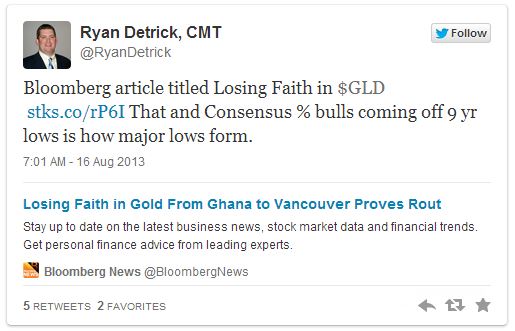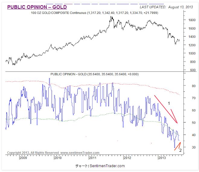 ÃøÌ¾¥Ø¥Ã¥¸¥Õ¥¡¥ó¥É¡¦¥Þ¥Í¡¼¥¸¥ã¡¼¡¢¥¸¥ç¥ó¡¦¥Ý¡¼¥ë¥½¥ó»á¤¬¶âETP¤òÇä¤Ã¤¿¡£ 8·î14Æü¡Ê¥Ö¥ë¡¼¥à¥Ð¡¼¥°¡Ë¡§¶â¤ò΢ÉÕ¤±¤È¤¹¤ë¾å¾ì¼è°ú·¿¶âÍ»¾¦ÉÊ¡ÊETP¡Ë¡ÖSPDR¥´¡¼¥ë¥É¡¦¥È¥é¥¹¥È¡×¤ÎºÇÂç¤ÎÊÝͼԤǤ¢¤ëÊÆ»ñ»º²È¥¸¥ç¥ó¡¦¥Ý¡¼¥ë¥½¥ó»á¤Ï¡¢¶â²Á³Ê¤¬¼åµ¤Áê¾ìÆþ¤ê¤·¤¿¤³¤È¤ò¼õ¤±¡¢»ý¤Áʬ¤ò53¡ó½Ì¾®¤·¤¿¡£ ´è¸Ç¤Ê¶â¤Î¿®Êô¼Ô¤¬¤Ä¤¤¤Ë¹ßÉú¤À¡£¤â¤Á¤í¤ó¡¢È¾Ê¬Çä¤Ã¤¿¤À¤±¤À¤«¤éÁ´Ì̹ßÉú¤Ç¤Ï¤Ê¤¤¡¢¤È¤¤¤¦È¿ÏÀ¤â¤¢¤ë¤¬¡¢¤³¤Î¥Ë¥å¡¼¥¹¤Ëʰ³´¤¹¤ëÅê»ñ²È¤¿¤Á¤â¤¤¤ë¡£ ¤Ä¤¤1¥«·îÁ°¤Þ¤Ç¡¢¥Ý¡¼¥ë¥½¥ó»á¤Ï¶âÅê»ñ¤òÅê»ñ²È¤¿¤Á¤Ë´«¤á¤Æ¤¤¤¿¤¬¡¢»á¤¬¼ÂºÝ¤Ë¹Ô¤Ê¤Ã¤Æ¤¤¤¿¤³¤È¤Ï¶â¤ÎÇä¤ê¤À¡£¤â¤·¡¢¤³¤ì¤¬°Õ¿ÞŪ¤Ê¤éÆ»µÁ¤ËÈ¿¤¹¤ë¹Ô°Ù¤À¤¬¡¢ÂçÎ̤ʥե¡¥ó¥É²òÌó¤Î¿½¤·¹þ¤ß¤¬¸¶°ø¤Ç¡¢»ÅÊý̵¤¯¶â¤òÇäµÑ¤·¤¿¤È¤¤¤¦¤³¤È¤â¹Í¤¨¤é¤ì¤ë¡£ Áê¾ì¤ÎÀ¤³¦¤Ç¸À¤ï¤ì¤ë¤³¤È¤À¤¬¡¢´è¸Ç¤Ê¶¯µ¤ÏÀ¼Ô¤¬³ô¤ò¼êÊü¤¹»þ¤Ï¥Þ¡¼¥±¥Ã¥È¤ÎÄ줬¶á¤¤¡£¤½¤ÎÈ¿ÂФˡ¢Ëüǯ¥Ù¥¢¤¬Ç㤤¤Ëž¤¸¤ë»þ¤Ï¡¢¥Þ¡¼¥±¥Ã¥È¤ÏÅ·°æ¤ò·ÁÀ®¤·¤Æ¤¤¤ë²ÄǽÀ¤¬¹â¤¤¡£¤È¤¤¤¦¤³¤È¤Ç¡¢Ä¶¶¯µ¤¤Ê¥Ý¡¼¥ë¥½¥ó»á¤¬¼åµ¤¤Ë¤Ê¤Ã¤¿¤Î¤À¤«¤é¡¢¤³¤ì¤Ï¶â¤ÎÄìÂǤÁ¥·¥°¥Ê¥ë¤À¡¢¤È¤¤¤¦°Õ¸«¤¬ÁᮽФƤ¤¤ë¡£ ¥Ý¡¼¥ë¥½¥ó»á¤¬Çä¤Ã¤¿¤«¤é¤È¸À¤Ã¤Æ¡¢¶âETPÊÝ»ý¼Ô¤¬¥¼¥í¤Ë¤Ê¤Ã¤¿Ìõ¤Ç¤Ï¤Ê¤¤¡£¤·¤«¤·Åê»ñ¿´Íý¤ò¹Íθ¤·¤¿¾ì¹ç¡¢ÃøÌ¾¶¯µ¤Åê»ñ²È¤Ë¤è¤ëÂçÎ̤ÊÇäµÑ¤Ï¡¢¥Þ¡¼¥±¥Ã¥È¤ÎÄì·ÁÀ®¤Ë¹¥ºàÎÁ¤È¤Ê¤ë¡£ -- ¥Þ¥¤¥¯¡¦¥·¥§¥É¥í¥Ã¥¯»á¡ÊÅê»ñ¥¢¥É¥Ð¥¤¥¶¡¼¡Ë ¥é¥¤¥¢¥ó¡¦¥Ç¥È¥ê¥Ã¥¯»á¡Ê¥·¥§¥¤¥Õ¥¡¡¼¥º¡¦¥¤¥ó¥Ù¥¹¥È¥á¥ó¥È¡¦¥ê¥µ¡¼¥Á¡Ë¤Ï¡¢¤³¤ó¤Ê¥Ä¥¤¡¼¥È¤ò¤·¤Æ¤¤¤ë¡£ ¡Ö¥Ö¥ë¡¼¥à¥Ð¡¼¥°¤Ë¡È¶â¤ò¿®ÍѤǤ¤Ê¤¯¤Ê¤Ã¤¿¡É¤È¤¤¤¦µ»ö¤¬·ÇºÜ¤µ¤ì¤Æ¤¤¤ë¡£¤½¤Î°ìÊý¡¢Åê»ñ²È¤¿¤Á¤Î¶â¤ËÂФ¹¤ë¥»¥ó¥Á¥á¥ó¥È¤Ï¡¢9ǯ¤Ö¤ê¤ÎºÇ°¥ì¥Ù¥ë¤«¤é²óÉü¤¬»Ï¤Þ¤Ã¤Æ¤¤¤ë¡£ÂçÄì¤Ï¤³¤Î¤è¤¦¤Ê¾õ¶·¤Ç·ÁÀ®¤µ¤ì¤ë¤â¤Î¤À¡£¡× ¾å¤Î¥Á¥ã¡¼¥È¤Ë¤Ï¡¢Åê»ñ²È¤¿¤Á¤Î¶â¤ËÂФ¹¤ë¥»¥ó¥Á¥á¥ó¥È¤Î¿ä°Ü¤¬¼¨¤µ¤ì¤Æ¤¤¤ë¡£1¤ÎÌð°õ¤Çʬ¤«¤ë¤è¤¦¤Ë¡¢¶¯µ¤¥»¥ó¥Á¥á¥ó¥È¤ÏÁêÊѤï¤é¤º²¼¤²Êý¸þ¤À¤¬¡¢ºÇ¶á¤Îư¤¡Ê2¡Ë¤À¤±¤ò¸«¤ë¤È¾å¾º¤¬»Ï¤Þ¤Ã¤Æ¤¤¤ë¡£ ¡È¶â¤ò¿®ÍѤǤ¤Ê¤¯¤Ê¤Ã¤¿¡É¡¢¤È¤¤¤¦¥Ö¥ë¡¼¥à¥Ð¡¼¥°¤Îµ»ö¤«¤é°úÍѤ·¤è¤¦¡£ ¡Ö»ä¤¿¤Á¤¬ÊÝͤ·¤Æ¤¤¤ë¤Î¤Ï¥´¥ßÂÞ¤À¡×¡¢¤È¥Õ¥£¥ê¥Ã¥×¡¦¥Þ¥ó»á¡Ê53ºÐ¡Ë¤Ï¸À¤¦¡£2009ǯ°ÊÍè¡¢¥Þ¥óÉ׺ʤÏÂ࿦¸å¤Î¤¿¤á¤ÎÃùÃߤ«¤éÌóȾʬ¤ËÁêÅö¤¹¤ë16Ëü¥É¥ë¤ò°ú¤½Ð¤·¤Æ¡¢¶â²ß¤È¶ä²ß¤òÇã¤Ã¤¿¡£¤·¤«¤·¡¢¤½¤ì¤é¤Ï40¡ó¤ÎÃͲ¼¤¬¤ê¤È¤Ê¤ê¡¢Í½Äꤷ¤Æ¤¤¤¿½»Âð¤Î¹ØÆþ¤¬ÉÔ²Äǽ¤Ë¤Ê¤Ã¤Æ¤·¤Þ¤Ã¤¿¡£ ¡Ö»ä¤¿¤Á¤¬ÊÝͤ·¤Æ¤¤¤ë¤Î¤Ï¥´¥ßÂÞ¤À¡£¡× ¸À¤¦¤Þ¤Ç¤â¤Ê¤¯¡¢¤³¤ì°Ê¾å°¤¤¥»¥ó¥Á¥á¥ó¥È¤Ï̵¤¤¡£¤â¤¦°ìÅÙ¡¢¾å¤Î¥Á¥ã¡¼¥È¤ò¸«¤Æ¤Û¤·¤¤¡£¶â¤Ï¥´¥ß¤Î¤è¤¦¤Ê¤â¤Î¤À¡¢¤È»×¤Ã¤Æ¤¤¤ë¿Í¤¿¤Á¤Ï¡¢¥Þ¥ó»á°Ê³°¤Ë¤â¿¿ô¤¤¤ë¤³¤È¤À¤í¤¦¡£¶â¤Ï´û¤ËÄì¤òÂǤä¿¡¢¤ÈÃǸÀ¤¹¤ë¤³¤È¤Ï¤Ç¤¤Ê¤¤¤¬¡¢¤³¤³¤«¤é¤Ï¶â¤ÎÀѶËŪ¤Ê¶õÇä¤ê¤òÈò¤±¤¿¤¤¤È»×¤¦¡£ ¡Ê»²¾È¤·¤¿µ»ö¡§¥Ý¡¼¥ë¥½¥ó»á¤¬¶âETP¤ÎÊÝͽ̾®¡¢¥½¥í¥¹»á¤ÏÁ´¤ÆÇäµÑ Losing Faith in Gold From Ghana to Vancouver Proves Rout Losing Faith in Gold at the Wrong Time; Did Paulson's Sale Mark the Bottom? Who's Left to Sell?¡Ë