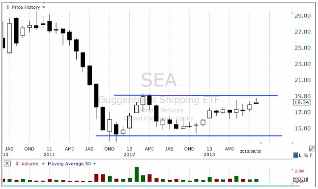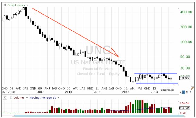 8月のマーケットが終了です。夏休みも終わり、いよいよ秋の相場が始まります。今月の月足が完成したので、あれこれと月足チャートを見ているところですが、何と言っても弱いのがコーヒーの上場投資証券(ETN)です。 2011年の5月がピークとなり、この2年間で66%の下落です。今月の出来高は6月と7月を上回り、相変わらず売り物が多い状況です。こんな下げ方ですから、買い手は完全に元気を失い、コーヒーは正に忘れられた存在になってしまいました。 大幅下落、忘れられた存在で思い出すのは天然ガスです。 天然ガスのETFですが、2008年7月から2012年4月までのベアマーケットで記録した下げは、95%という恐ろしい下げ幅です。こんなチャートを見る度に思うことは、素早い損切りの重要性です。最近は横ばいが続いています。これだけ下げた後ですから、この横ばいの次にやって来るのは、上放れだと思います。言い換えると、天然ガスは現在ステージ1の形成中です。 長期的に投資できる人なら、ステージ1で買うのが良いと思います。値動きは横ばいで退屈な展開ですから、急いで買う必要はありません。余談になりますが、人気株がテレビで取り上げられるのは、ほとんどの場合ステージ3です。 原油もステージ1と思われます。下は原油のETFです。 厳しい下げが終わり横ばいが続いています。 それと、海運株もステージ1です。 海運株のETFです。横ばいが続き、上げ相場への準備中といった感じがします。
