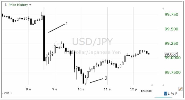 政府が発表する数字など信じらない、という声が多いですが、米雇用統計発表直後の為替市場は荒れます。たとえば、下はドル/円(5分足チャート)の動きです。 発表直後、長い陰線(1)が形成され、2のローソク足で分かりますが、ドル/円は98.55円付近まで下げたところで反発が始まっています。なぜ、ここで反発したのでしょうか。 上は日足チャートです。反発が起きた場所は三角形の上辺(A)です。ブレイクアウトの買い方法は3つあります。 1、ブレイクアウトと同時に買う。 2、トレンドラインに戻ったところで買う。 3、ブレイクアウト後に形成された高値突破で買う。 もう一度、ドル/円の日足チャートに戻りましょう。 1、ブレイクアウトでの買い。 2、上辺へ戻ったところでの買い。 3、次の買いは木曜の高値突破です。