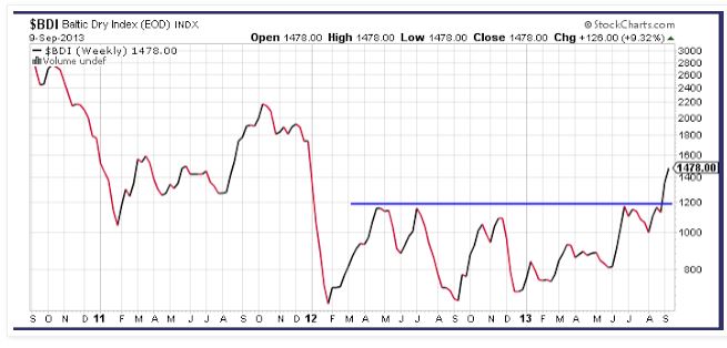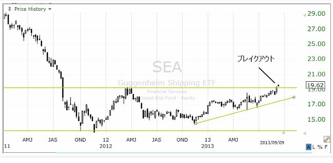 バルチック海運指数が、レジスタンスになっていた1200レベルを突破した。 バルチック海運指数(Baltic Dry Index):通称BDIは、ロンドンのバルチック海運取引所が発表する外航不定期船の運賃指数。バルチック海運取引所は海運会社やブローカーなどから鉄鉱石・石炭・穀物といった乾貨物(ドライカーゴ)を運搬する外航不定期船の運賃を聞き取り、結果を取りまとめて同指数を算出、発表する。基準となる1985年1月4日を1000として算定している。(中略)特に、当指数が注目を集めるようになったのは、中国の鉄鉱石輸入を始めとする世界的な原料輸送需要の高まりが背景にあった。(中略)株式市場においては、海運会社の株価への影響が大きく、特に不定期船を主力とする会社の株価とは連動性が高い。(ウィキペディアから) キーワードは青字の部分、「中国」と「海運会社」だ。月曜のコラムで、ジム・クレーマー氏(The Street)は、こう書いている。 中国の経済回復は本物であり、この回復を過小評価してはいけない。中国の経済回復の証拠が欲しいなら、ヤム・ブランズ株(ティッカー:YUM)の動きを見てみることだ。決算の結果は大したことはなかったが、マーケットはそんなことを気にしていない。 中国の状況はバルチック海運指数に表れる。昨夜、たった一晩でバルチック海運指数は126ポイントの大幅上昇となり海運株に買いが集まった。特に注目したいのはダイアナ・シッピング(ティッカー:DSX)だ。 ヤム・ブランズ:ファストフード・チェーンの世界最大手。KFC、ピザハット、タコベルなどを経営し、中国への進出に積極的。 ダイアナ・シッピング:ドライバルク・キャリア (バラ積み船) を所有・運営する。世界中の航路を利用して、鉄鉱石、穀物、その他 乾燥物などの運搬を手掛ける。本社はギリシャのアテネ。 ということで、クレーマー氏は、中国でビジネスを展開する企業の株に注目している。 海運株は、いよいよアップトレンドに入ったようだ。海運株のETF、Claymore/Delta Global Shippingの週足チャートを見てみよう。 ブレイクアウトで分かるように、海運株はステージ1を終え、いよいよステージ2のアップトレンドに入ったようだ。 (情報源:Cramer: The China Turn Is Real -- and Powerful)