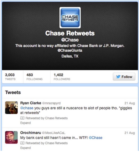 JPモルガンに、ツイッターのハンドル名を奪われてしまった、という話がある。ご存知のように、JPモルガンは大手金融機関であり、正式名はJPモルガン・チェース&カンパニーだ。 JPモルガン・チェース(JPMorgan Chase & Co.)は、アメリカ合衆国ニューヨークに本拠地を置く銀行持株会社で、商業銀行であるJPモルガン・チェース銀行(JPMorgan Chase Bank, N.A.)や投資銀行であるJPモルガン(J.P. Morgan)を子会社として有する。(ウィキペディアから) ツイッターのハンドル名が使えなくなってしまったのはチェース・ジウンタさん(25歳)、テキサス州在住のグラフィック・デザイナーだ。8月の終わり頃まで、ジウンタさんは、こういうハンドル名でツイートをしていた。 @Chaseで分かるように、ジウンタさんは自分の名前をハンドル名にした。しかし、このハンドル名からはJPモルガン・チェースが連想されることも事実だ。そんな誤解を防ぐためだと思うが、@Chaseの下には「このアカウントはJPモルガン・チェースとは一切関係無い」、という断り書きがある。 ニューヨーク・ポストから抜粋しよう。 ・@Chaseでは、他の人たちによってツイートされた大手銀行非難が頻繁にリツイートされていた。 ・JPモルガン・チェースは@Chaseを約1年にわたって追跡しており、商標権を侵害されたとして苦情を最近申し立てていた。 ・先週木曜、ツイッター社は@Chaseのハンドル名をジウンタさんから取り上げJPモルガン・チェースに渡した。(それまではJPモルガン・チェースは@ChaseNewsというハンドル名を使っていた。) ・ツイッターには、不正に商標を利用して意図的に誤解を招くツイートをした場合は、アカウントが停止されるという利用規約がある。 ・ツイッター社は、ハンドル名を取り上げる前に、ジウンタさんに規約に従うように警告した。 ・ハンドル名を取り上げられる前、ブローカーと名乗る人から、「@Chaseのハンドル名を放棄するなら2万ドルを支払う」、という話がジウンタさんに持ちかけられた。しかし、ツイッター社はハンドル名の販売を禁じているため、ジウンタさんはその話を断った。 ジウンタさんのしたことは、ツイッター利用規約に違反する「不正に商標を利用して意図的に誤解を招くツイート」に相当するのだろうか。A Lightning War for Libertyは、こう書いている。 ジウンタさんの名前がチェースでなかったなら話は別だが、現にジウンタさんの名前はチェースだ。今回の件で明らかになったことは、企業は好きなハンドル名を使うことができるが、個人にはその権利は無いということだ。 言うまでもなく、JPモルガン・チェースはジウンタさんのことを苦々しく思っていた。使いたかったハンドル名(@Chase)をジウンタさんに先取りされ、@ChaseNewsなどというどこかの報道機関のようなハンドル名を使うしかなかった。 繰り返しになるが、ジウンタさんのツイッターには、ジウンタさんがJPモルガン・チェースの関係者でないことが明記されている。言い換えれば、ジウンタさんの行ったリツイートをJPモルガン・チェースの意見と解釈した人は、ほとんどいない筈だ。 JPモルガン・チェースは、ツイッター社に圧力をかけて、ジウンタさんからハンドル名を取り上げることに成功した。言い方は幼稚になるが、JPモルガン・チェースのしたことは弱い者いじめと同じだ。ジウンタさんは、こんなことも語っている。「こういう結果になるのなら、2万ドルの話を承諾するべきでした。」 (参照した記事:JP Morgan ‘Chases’ off Twitter squatter JP Morgan Targets Twitter Activist and Subsequently Takes His Handle)