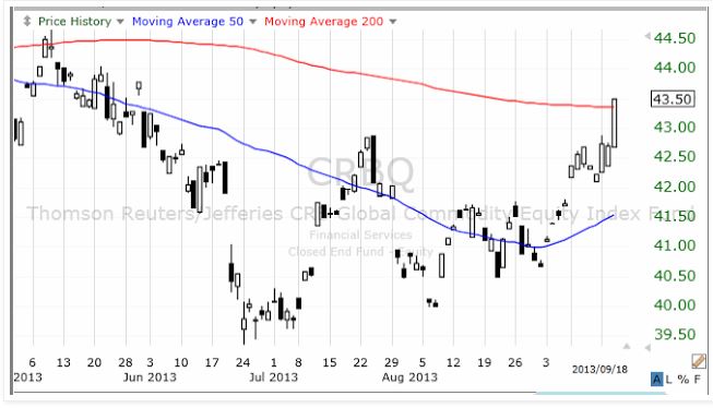 先週、ゴールドマン・サックスのアナリストは、こんなことを述べていた。 金価格の下落は今年だけでなく2014年も続くだろう。米国経済は回復方向にあり、FRBは現状のような金融緩和策を継続する必要が無くなる。来週のFOMCで、予想どおり債券買い入れ縮小が決定されれば、金の売りが加速することだろう。 しかし、予想された債券買い入れ縮小は無かった。 米FOMC、量的緩和の縮小見送り 雇用動向見極め(日本経済新聞) 下が、バーナンキ議長のコメントの要旨だ。 http://youtu.be/szwclmmKwLg 量的緩和の縮小は実施されないということで金に買いが殺到し、金のETFは+4.4%、そして金鉱株のETFは+8.83%の大幅上昇で水曜の取り引きを終えた。 FOMCからのメッセージは簡潔明瞭だ。現在の米国経済には独り歩きするほどの力は無い。ルービニ教授が、こんなツイートをしていた。 「市場予想とは反対になるが、最近の弱いマクロ経済と住宅市場のデータを考えると、FRBは量的緩和縮小を実施するべきではない。ひょっとすると今日のFOMCでは、縮小を実施しないということが決定されるかもしれない。もし縮小が決定されたとしても、それは小規模なものになるだろう。」 ほとんどの人たちは債券買い入れが縮小されることを予想していたから、ルービニ氏の意見は少数派だ。 金のETFのチャートを見てみよう。(5分足) FOMC終了直後に極めて大きな陽線(1)が形成された。跳ね上がった出来高(A)で分かるように、正に買い手の殺到だ。ゴールドマン・サックスが予想したように、債券買い入れ縮小という発表だったら大陰線が形成されたかもしれない。 気になるのは、FOMCが終了する45分前に形成された陽線(2)だ。短いローソク足が続いていたのに突然長い陽線が形成されただけでなく、出来高(B)も突出している。もちろん証拠は無いが、こんな陽線を見ると、FOMCの発表内容が漏れていたのでは、と疑ってしまう。 量的緩和の縮小見送りでドル指数がブレイクダウンとなった。 上はドル指数に連動するETF(日足)だが、サポートラインを大きく割り、ほぼ安値で終了した。このドル安で恩恵を受けたのは商品だ。 原油、トウモロコシ、金、銀などの商品に関連した株に投資しているETF、Jefferies TR/J CRB Global Commodity Equityの日足チャートを見てみよう。 長い陽線を形成し、長期トレンドを示す200日移動平均線(赤)を越えての終了だ。中期トレンドを示す50日移動平均線(青)は既に上昇が始まり、このまま上昇が続くと200日移動平均線を突破して、投資家たちにお馴染みのゴールデン・クロスが起きる。ということで商品市場の低迷が終わり、いよいよ上げ相場が到来したようだ。(注:Jefferies TR/J CRB Global Commodity Equityは出来高が少ないのでトレードには向いていない。) (参照した記事:米FOMC、量的緩和の縮小見送り 雇用動向見極め 迫るFOMC、不安な金投資家)