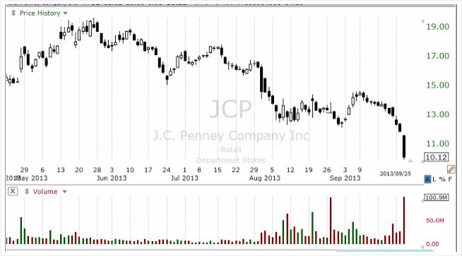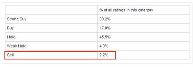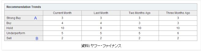 米国のアナリストは「売り推奨」をなかなか出さない。見込みのない株なら、アナリストは投資家たちに売ることを勧めるべきだと思うのだが、「売れ」と公言することはかなり難しいようだ。マーク・ハルバート氏の記事に、こういうデータが載っている。 赤で囲った部分に注目してほしい。S&P500指数は500の銘柄で構成されているが、売り推奨が出されているのは、たったの2.2%だ。言い換えれば、売り対象となっているのは11銘柄しかない。 今朝、こんなニュースが報道された。 米JCペニーが13年ぶり安値、売上高改善の遅れをゴールドマンが警告 [25日 ロイター] - 25日の米株式市場の取引で、百貨店JCペニーの株価が急落し、一時約13年ぶりの安値をつけた。ゴールドマン・サックスが、同社売上高の改善ペースが予想よりも緩慢になるとの見通しを示したことを嫌気している。 下がJCペニーの日足チャートだ。 今日の下げは確かに特大だが、見てのとおり、下げが始まったのでは今日ではない。上のチャートには最近5カ月間の動きしか表示されていないが、JCペニーの下げが始まったのは2012年の2月だ。これだけ長い低迷が続いているのだが、この株に対するアナリストの意見には大した変化が無い。 3カ月前、強い買いを勧めていたアナリストは3人。そしてこの数は今日も3人(A)。3カ月前、JCペニーの売りを勧めていたアナリストは二人、そして今日もこの数字は二人だ(B)。一番多いのは、真ん中のホールド推奨だ。3カ月前は10人、そして今日も10人ということで数値に変化は無い。(ホールド推奨:もしこの株を既に保有しているなら保有し続けても構わない。しかし、買い足しは勧められない。) この3カ月間で、JCペニーの株価は40%も下げている。しかし売りを勧めているアナリストは、24人中2人だけだ。マーク・ハルバート氏は、こう結論している。「ウォール街は株の売り時を教えてくれない。ホールド=売り、と解釈するべきだろう。」 (参照した記事:米JCペニーが13年ぶり安値、売上高改善の遅れをゴールドマンが警告 Why Wall Street couldn’t say ‘sell’ on BlackBerry)