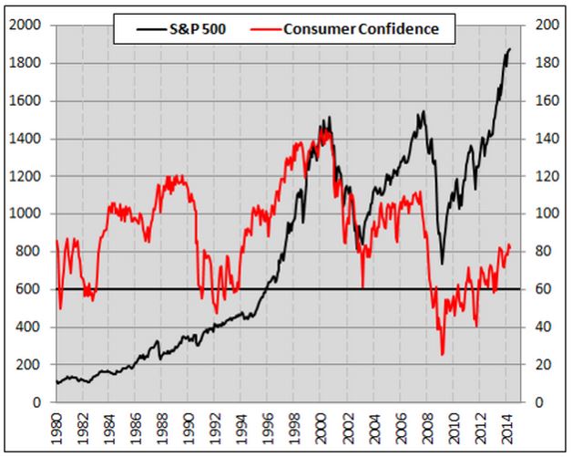 ÌÚÍˤΥޡ¼¥±¥Ã¥È½ªÎ»¤Þ¤Ç¤¢¤È30ʬ¤ò»Ä¤·¡¢¥À¥¦¹©¶È³ô30¼ïÊ¿¶Ñ¤Ï¸½ºß0.7¡ó¤Î²¼¤²¡¢S&P500»Ø¿ô¤Ï¥Þ¥¤¥Ê¥¹0.8¡ó¤Ç¤¹¡£²¼¤Ï¥À¥¦¹©¶È³ô30¼ïÊ¿¶Ñ¤Î½µÂ¥Á¥ã¡¼¥È¤Ç¤¹¡£ ¶¯¤¤¾å¾ºÁê¾ì¤¬Å¸³«¤µ¤ì¤Æ¤¤¤Þ¤¹¤¬¡¢¥Á¥ã¡¼¥ë¥º¡¦¥Ñ¥·¥£»á¡Ê¥Þ¡¼¥±¥Ã¥È¡¦¥¦¥©¥Ã¥Á¡Ë¤Ï¡¢¤³¤ó¤Ê¤³¤È¤ò»ØÅ¦¤·¤Æ¤¤¤Þ¤¹¡£ ¹âÃͤ¬¹¹¿·¤µ¤ì¡¢¹¥Ä´¤Ê³ô¼°»Ô¾ì¤¬Â³¤¤¤Æ¤¤¤ë¤¬¡¢¤À¤«¤é¤È¸À¤Ã¤ÆÊƹñ¾ÃÈñ¼Ô¤ÎÅê»ñ¸ýºÂ»Ä¹â¤Ë¤âƱÍͤʤ³¤È¤¬µ¯¤¤Æ¤¤¤ë¤ï¤±¤Ç¤Ï¤Ê¤¤¡£¸À¤¤´¹¤¨¤ë¤È¡¢Â¿¤¯¤Î¿Í¡¹¤ÏÊÆ¹ñ·ÐºÑ¤òÁêÊѤï¤é¤º¿®ÍѤ¹¤ë¤³¤È¤¬¤Ç¤¤Ê¤¤¤Î¤À¡£ ¾ÃÈñ¼Ô¿®Íê´¶»Ø¿ô¤È¤¤¤¦¡¢Êƹñ¾ÃÈñ¼Ô¤¿¤Á¤Î·ÐºÑ¤ËÂФ¹¤ë¿®ÍÑÅÙ¤ò¼¨¤¹»ØÉ¸¤¬¤¢¤ë¡£¥Ï¥¤¥Æ¥¯³ô¥Ö¡¼¥à¡¢¥¤¥ó¥¿¡¼¥Í¥Ã¥È³ô¤¬Âç¿Íµ¤¤À¤Ã¤¿2000ǯ¡¢¾ÃÈñ¼Ô¿®Íê´¶»Ø¿ô¤Ï144.7¤À¤Ã¤¿¡£¤½¤·¤Æ³ô¼°»Ô¾ì¤¬»Ë¾åºÇ¹âÃͤˤ¢¤ëº£Æü¡¢¤³¤Î»ØÉ¸¤Ï¤¿¤Ã¤¿¤Î83¤À¡£ ¸½ºß¤ÎÊÆ¹ñ¼º¶ÈΨ¤Ï6.3¡ó¡¢2009ǯ10·î¤Î10¡ó¤«¤éÂçÉý¤Ë²¼¤¬¤Ã¤Æ¤¤¤ë¡£¾ÃÈñ¼Ôʪ²Á»Ø¿ô¤â²º¤ä¤«¤Ê¥Ú¡¼¥¹¤Ç¾å¾º¤·¡¢Êƹñ·ÐºÑ¤Ï·è¤·¤Æ°¤¤¾õÂ֤ǤϤʤ¤¡£¹¹¤Ë¡¢Ê¿¶ÑŪ¤Ê401K¤Î»Ä¹â¤Ï2008ǯ¤Î5Ëü6000¥É¥ë¤«¤é10Ëü2000¥É¥ë¡Ê2013ǯËö¡Ë¤ËÁý¤¨¤Æ¤¤¤ë¡£ 5·î5Æü¤Ë¤Ê¤ê¤Þ¤¹¤¬¡¢¥·¥§¥¤¥Õ¥¡¡¼¥º¡¦¥¤¥ó¥Ù¥¹¥È¥á¥ó¥È¤Ï¡¢¤³¤ó¤Ê¥Á¥ã¡¼¥È¤ò¥Ö¥í¥°¤Ë·ÇºÜ¤·¤Æ¤¤¤Þ¤¹¡£ ¹õ¤¤Àþ¤ÏS&P500»Ø¿ô¡¢ÀÖ¤¤Àþ¤Ï¾ÃÈñ¼Ô¿®Íê´¶»Ø¿ô¤Ç¤¹¡£ 2000ǯ¤Ë145¤À¤Ã¤¿¾ÃÈñ¼Ô¿®Íê´¶¿ô¤Ï2007ǯ¤Ë¤Ï110¡¢¤½¤·¤Æ¸½ºß¤Î¿ôÃͤÏ82¤À¡£·ëÏÀ¤ò¸À¤¦¤È¡¢¤³¤ÎÄ㤤¿ôÃͤÏS&P500»Ø¿ô¤Ë¹¥ºàÎÁ¤À¡£·ÐºÑ¤ÎÄã̤¬¾ÃÈñ¼Ô¿®Íê´¶»Ø¿ô¤Ë°±Æ¶Á¤È¤Ê¤Ã¤¿¤³¤È¤Ï³Î¤«¤À¤¬¡¢³ô¼°»Ô¾ì¤¬ºÇ½ªÅª¤ÊÅ·°æ¤ò·ÁÀ®¤¹¤ë¤¿¤á¤Ë¤Ï¡¢¾ÃÈñ¼Ô¿®Íê´¶»Ø¿ô¤Ï¤³¤³¤«¤é¤â¤Ã¤È¤â¤Ã¤È¹â¤¤¥ì¥Ù¥ë¤Ë㤹¤ëɬÍפ¬¤¢¤ë¤È»×¤ï¤ì¤ë¡£ ¾Ú·ô¶È³¦¤ÎÃοͤ¿¤Á¤È¤Ï³ô¤ÎÏäò¤·¤Þ¤¹¤¬¡¢¤½¤ì°Ê³°¤Î¿Í¤¿¤Á¤«¤é³ô¤ÎÏäòʹ¤¯¤³¤È¤Ï¤¢¤ê¤Þ¤»¤ó¡£Êì¿Æ¤äͧ¿Í¤«¤é³ô¤ÎÇ㤤¿ä¾©¤òʹ¤¯¤è¤¦¤Ë¤Ê¤Ã¤¿¤é¡¢¤¤¤è¤¤¤è¥Þ¡¼¥±¥Ã¥È¤ÏÅ·°æ¤À¤È¸À¤ï¤ì¤Þ¤¹¤¬¡¢¸½»þÅÀ¤Ç¤Ï¤½¤ó¤Ê¤³¤È¤Ïµ¯¤¤Æ¤¤¤Þ¤»¤ó¡£ ·«¤êÊÖ¤·¤Ë¤Ê¤ê¤Þ¤¹¤¬¡¢¤³¤ó¤Ê¤Ë¥Þ¡¼¥±¥Ã¥È¤Ï¹¥Ä´¤Ê¤Î¤Ë¡¢¿Í¡¹¤Ï¤¢¤Þ¤ê¤Ë¤âÀŤ«¤Ç¤¹¡£90ǯÂå¤Î¥Ö¥ë¥Þ¡¼¥±¥Ã¥È¤Ç¤Ï¼¡¡¹¤È¥Ç¥¤¥È¥ì¡¼¥À¡¼¤¬Åо줷¤Þ¤·¤¿¤¬¡¢º£Æü¥È¥ì¡¼¥É¤ÎÏäò¤¹¤ë¿Í¤Ï¤Û¤È¤ó¤É¤¤¤Þ¤»¤ó¡£³ô¤Ïµ¡´ØÅê»ñ²È¤À¤±¤Î¤â¤Î¤Ë¤Ê¤Ã¤Æ¤·¤Þ¤Ã¤¿¤Î¤Ç¤·¤ç¤¦¤«¡©¶âÍ»´íµ¡¤¬Êƹñ¾ÃÈñ¼Ô¤ËÍ¿¤¨¤¿¥À¥á¡¼¥¸¤Ï¡¢¤¢¤Þ¤ê¤Ë¤âÂ礤¹¤®¤¿¤è¤¦¤Ç¤¹¡£ ¡Ê»²¾È¤·¤¿µ»ö¡§Dow flirts with 17000, but most people missed the ride What Is Consumer Confidence Saying About Stocks?¡Ë