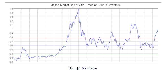 上のチャートは、Meb Faberリサーチ社のサイトに掲載されている日本のMarket Capitalization to GDPです。現在の数値は90%(0.9)、そして歴史的中央値は61%(0.61)です。適正数値は75%から90%までですから、この指標だけで判断すると、日本の株式市場はまだ割高ではありません。