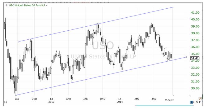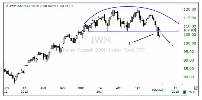 もう一度、小型株指数に連動するiShares Russell 2000 (IWM)の週足チャートを見てください。繰り返しになりますが、なだらかな半円が描かれ、どう見ても天井の形成中、といった様相です。更に、今日の投資環境は大きく変わり、投資家たちが資金を安全なものへ移動させていることを考えると、ここから小型株の上昇相場が再開するとは中々思えません。しかし、キンブル氏、グエントナー氏のような見方もあることを頭に入れておきたいと思います。