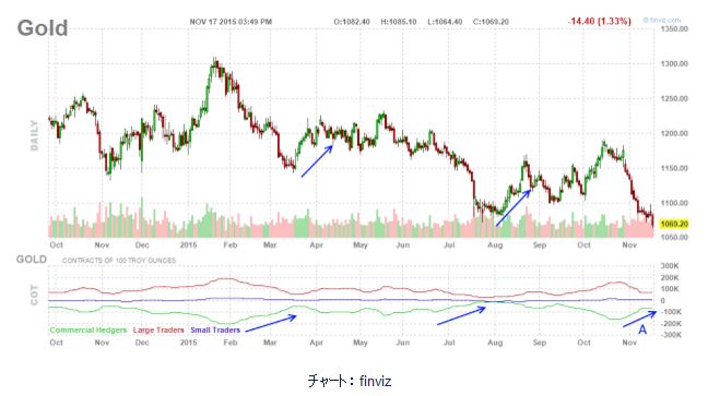 午前中にツイートしたことですが、下は金のETFの日足チャートにバランス・オブ・パワーという指標を入れたものです。 緑色の上に伸びる線は特に強い買い圧力が示され、赤色の部分は強い売り圧力が示されています。黒い矢印を付けましたが、今年に入ってから緑の線が現れた場所が4カ所あります。見てのとおり、これら4カ所は結果的に目先天井となっていますから、買った人たちの思惑は外れです。 売り圧力が強い部分は現在を含めて2カ所あります。1回目の売りは安値圏で売った形になり、現にこの売りの後ETF価格は上げに転じていますから、ここでの売りは間違いでした。現在も強い売りを示す赤い線が続出していますが、ここでの売りは正解でしょうか?バランス・オブ・パワーが明確に示していることは、人々は天井で買って底で売る傾向があるということですから、現在売っている人たちは後悔する可能性があります。 季節的に見た場合、11月は注目の月です。 上のチャートには、過去18年間の金指数の季節性が示されています。円で囲いましたが、11月の中頃に金指数は底打ちとなる傾向があります。現在、金のETFは売られている状態ですが、季節的な要素を考慮すると、ここでは売るのではなく買いを検討した方が良さそうです。 金の日足チャートです。下に入っている指標ですが、緑色の線はコマーシャル(当業者)の建玉状況です。0より下で推移しているので、当業者たちは空売り姿勢ですが、上昇する矢印(A)の方向で分かるように、当業者たちは空売りポジションを減らしている状態です。過去2回の例で分かるように、このようなことが起きた後には金価格が上昇しています。 繰り返しになりますが、現在の様子がAです。当業者たちは空売りを買い戻して、空売りポジションを減らしています。前回2回と同様なことが今回も起きる可能性がありますから、そろそろ金の上昇が始まるというシナリオも頭に入れておきたいと思います。