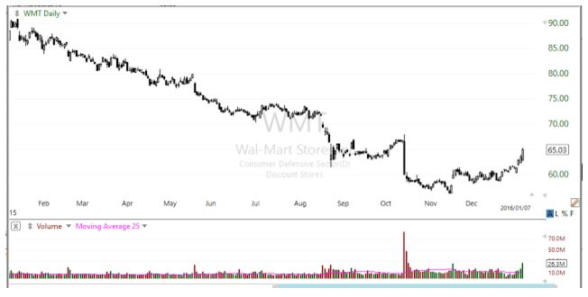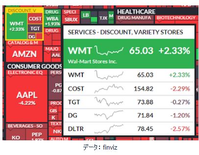 今日も米国株式市場は、ほぼ全面安となりました。 S&P500指数は2.37%という下げの中で目立ったのは、ディスカウント店最大手のウォルマート(WMT)です。 ウォルマートの終値は65ドル3セント、2.33%の大幅上昇です。同業者のコストコ(COST)、ターゲット(TGT)、ダラー・ゼネラル(DG)、それにダラー・ツリー(DLTR)は揃って下げていますから、ウォルマートの今日の上げはますます目立ちます。とうぜん疑問になることは、なぜウォルマートが買われているかということです。「ウォルマートのビジネス・モデルは既に時代遅れ。アマゾンに勝つことはできない」、と投資家たちから嫌われ、下の日足チャートで分かるように株価は低迷が続いていました。 報道されているように、世界的な株安となった大きな原因は下げが止まらない中国株式市場です。木曜のニューヨーク株式市場開始前には、著名投資家ジョージ・ソロス氏の「2008年の金融危機の再来だ」、という見方がマスコミに大きく取り上げられ、投資心理を冷え込ませる一因となったことは間違いないでしょう。「中国は新しい経済成長モデルを見つけることに大苦戦している。人民元の切り下げは、中国が抱える経済問題を世界にばらまいているだけであり、これが金融危機に結び付く」、というのがソロス氏の見方の要点です。 ウォルマートは投資家から嫌われ、低迷が続いていた株ですが、今日のソロス氏の言葉がウォルマートを買う一材料になったと思われます。先月の連邦公開市場委員会で金利引き上げがありましたが、一部の人たちは、「米国経済の減速が見え始めた現時点での利上げは間違っている」、ということを指摘していました。「米国の景気後退は近い、リセッションに陥る」、という少数意見が今朝のソロス氏の発言で大きく注目される結果となりました。 投資家たちはウォルマートを資金の避難場所に選んだのだ。景気が後退する状況では、消費者は割安な品物を揃えているディスカウント店を利用する傾向がある。現に、2008年の金融危機で、ウォルマート株は最も成績が良かった株の一つだ。もし今年、金融危機が起きるようなことがあれば、ウォルマート株は他の株より良い成績となることだろう。(インサイダー・モンキー) 12月16日のFOMCで金利が引き上げられ、その日の10年米国債の利回りは2.287%、そして今日の利回りは2.153%です。正に、大方の予想に反して利回りは下げている訳ですから、国債市場からは米国景気後退の可能性が示唆されている状態です。 (参照した記事:Soros: It's the 2008 crisis all over again Here’s Why These Stocks Are In the Green Today)
