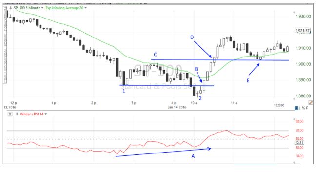 反発が来るのを待っていた。 -- スコット・ブラウン(レイモンド・ジェームズ) 続落が心配されたマーケットですが、S&P500指数は一転し、昨日の下げをほぼ帳消しにする強いラリーが展開されています。 上はS&P500指数の日足チャートです(木曜のマーケット終了1時間前時点)。ブラウン氏が言うように、多くのトレーダーは、反発が来るのを待っていました。理由は、S&P500指数がサポートレベル(A)に接近していたこと、それにストキャスティクスが示すように(矢印の部分)、マーケットは売られすぎであったためです。更に、「持ち株を全て売れ」、「マーケットは70%を超える大幅下落になる」、といった極論がマーケット関係者たちからも発表され、投資心理は冷え込んだ状態でした。言い換えると、皆が皆売りに傾いていましたから、そろそろ空売りの買い戻しが起きそうな状況でもありました。 残念ながら、急用のため午前中のマーケットをほとんど見ることができなかったのですが、今朝のマーケットには株の教科書に出てくるようなパターンが形成されています。下はS&P500指数の5分足チャートです。 結論から先に言うと、1、2と数字を入れましたが、これは二番目の安値が1番目の安値より低いダブルボトム(二番底)の買いパターンです。 1は単なる安値ではなく昨日の安値です。今朝の寄付き直後、S&P500指数は売りシグナルとなる昨日の安値を割りました。Aを見て下さい。これはRSI(相対力指数)ですが、S&P500指数とは反対に上昇し、一転反発の可能性を示すダイバージェンスが起きています。買い出動はB、既に割ってしまった1の安値を上回った時点で行います。 その次の買いチャンスはCの高値を越えたDです。Cの高値を突破することでダブルボトム形成が確認されますから、多くの株の本はCの高値突破で買うことを勧めています。BとDの買いチャンスを逃した人たちは、Cの高値がテストされたEで買ったことでしょう。これも多くの株の本に書かれていることですが、株価には上放れた場所に戻って来る習性があり、この戻りが買いチャンスになります。 つまらぬ理屈を書き並べてしまいました。急用だったので仕方ありませんが、今朝はマーケットを見ることができず、なんとなく調子の狂った一日となってしまいました。